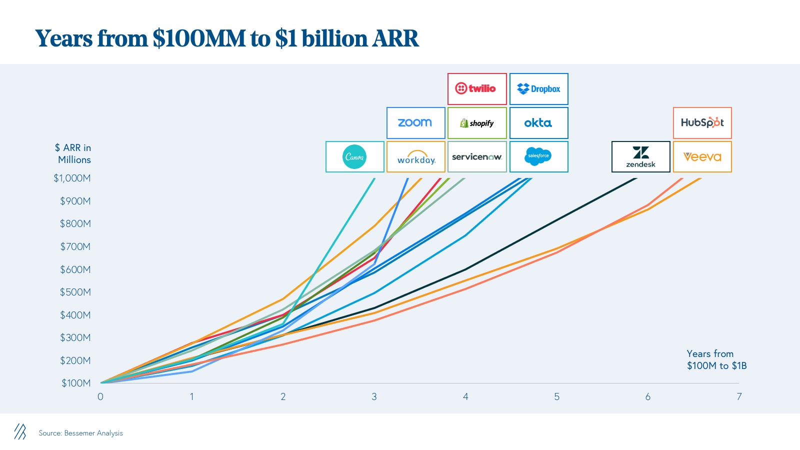 While some of the best cloud companies take four to eight years on average to reach the $100 million ARR milestone, many market leaders are able to accelerate to $1 billion ARR in seven years or less after they cross the $100M ARR mark. Businesses achieve these hyper-growth rates because scale helps to create a virtuous cycle of pricing power, customer awareness, and talent attraction that further widens a company’s lead over the competition.