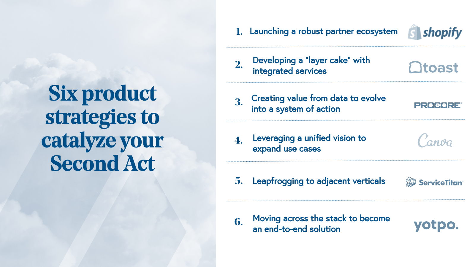 In this guide, we dive into six of the most effective scaling strategies we’ve seen from some of the most iconic cloud companies. All have gone on to become market leaders, thanks to powerful Second Acts.