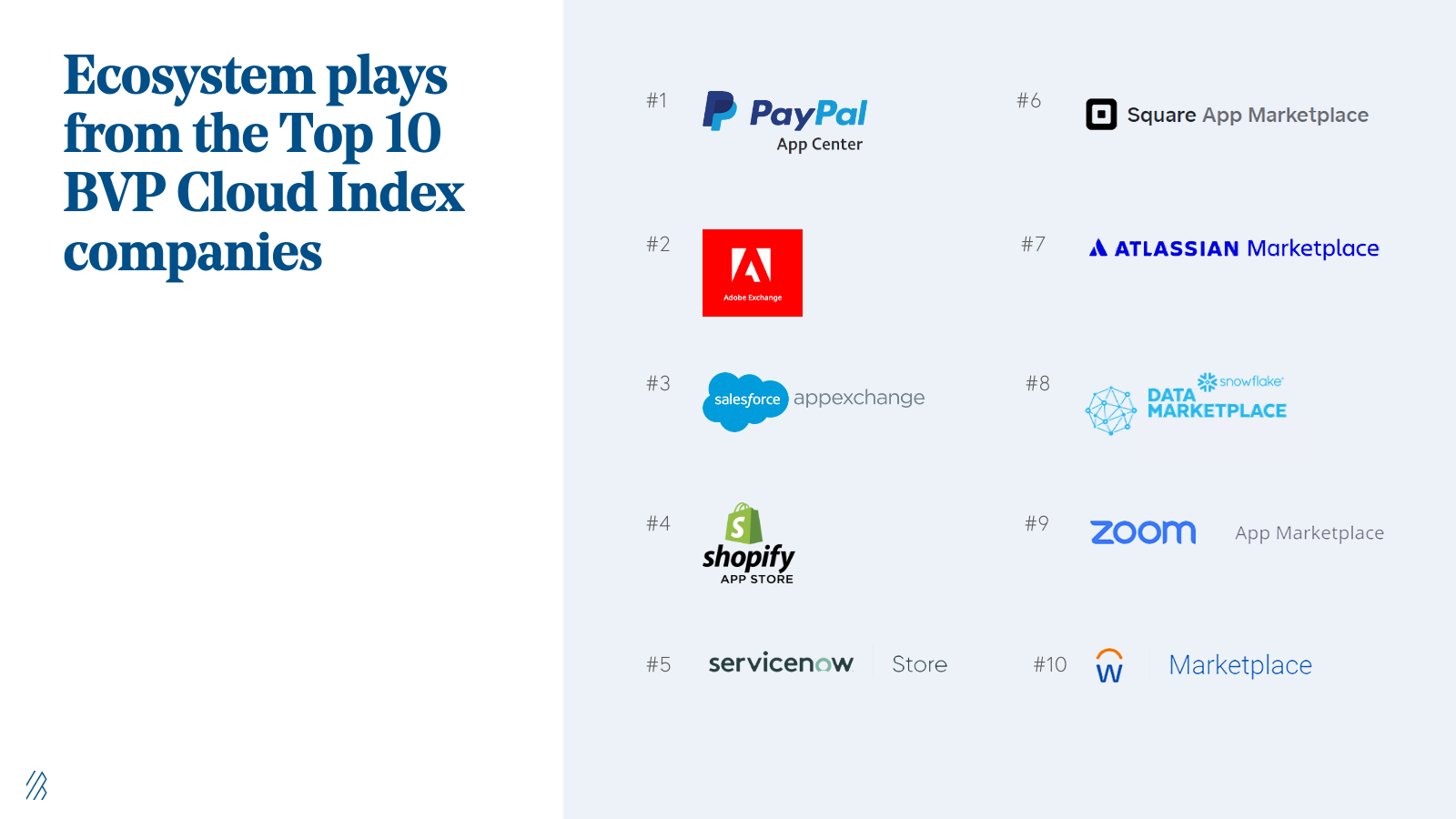 One hundred percent of the top 10 BVP Cloud Index companies by market capitalization offer an app or data marketplace. A majority implemented this strategy after reaching the $100 million ARR mark.