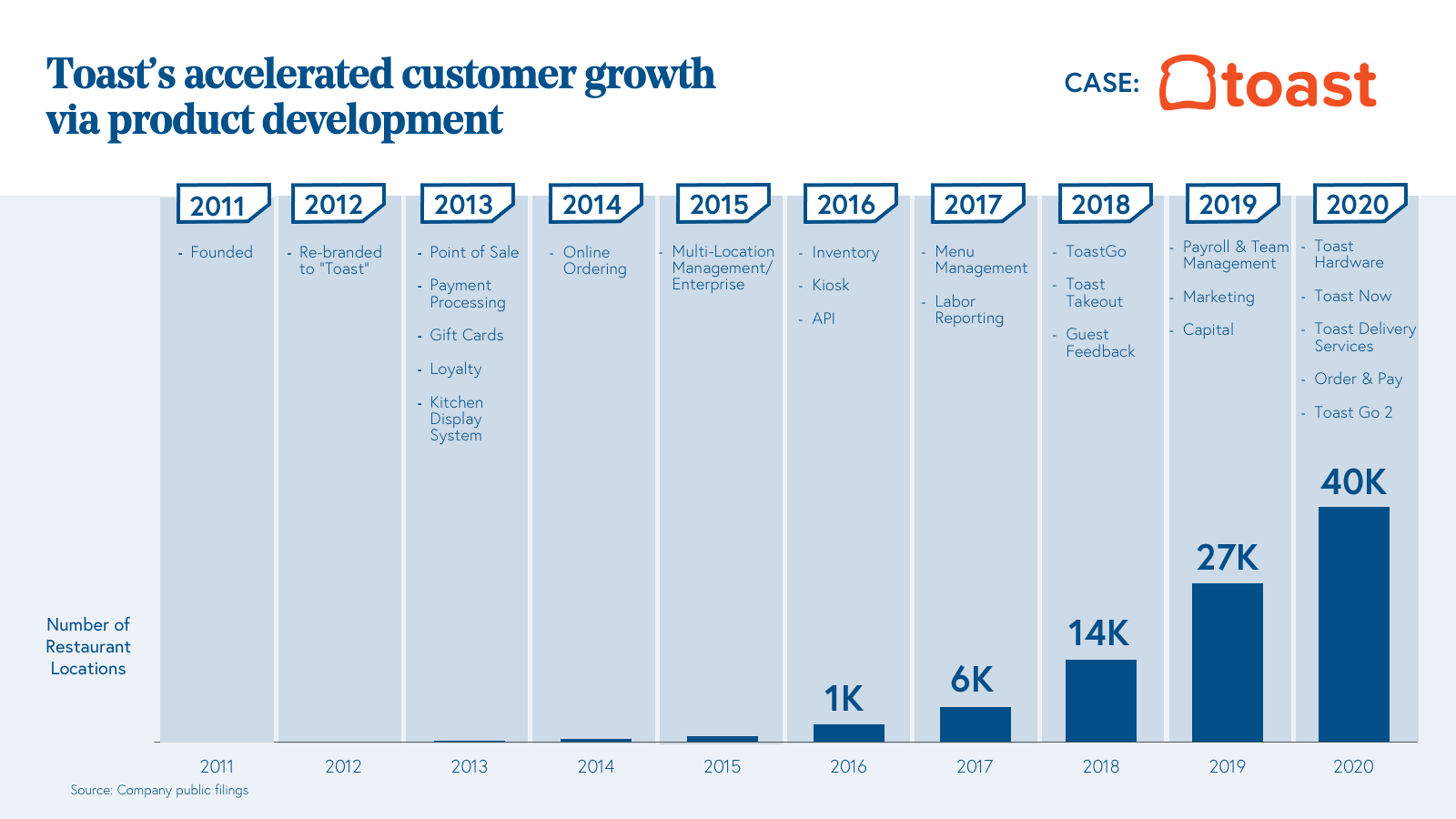 Our partner Kent Bennett led Toast’s first institutional investment in 2015 and recognized early on that the founding team had unmatched product chops. Indeed, since inception, this vertical software market leader has constantly introduced new products year after year to deepen capabilities on Toast’s platform for existing customers. On top of a point-of-sale hardware and software subscription, they layered solutions for back-of-house (the kitchen), back-office, digital guest engagement, and most recently, touchless guest experiences.