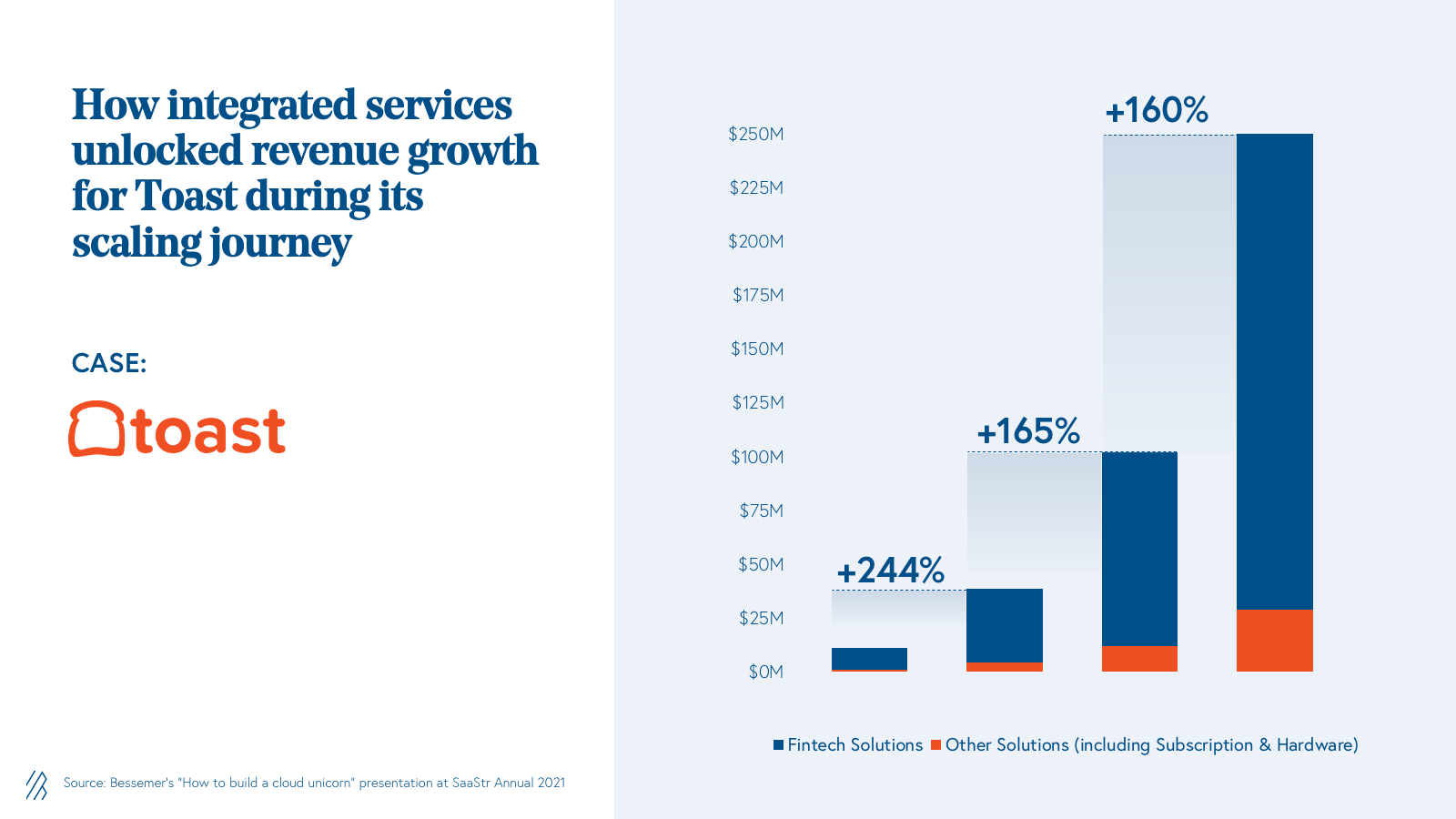 Toast keenly identified that some of the most highly monetizable layer cake opportunities involve adding integrated services such as payment processing to an existing platform. These integrated services tend to create a better end-to-end user experience than generic third-party point solutions. They’re also easier to cross-sell to existing customers because they supplant competitive offerings that customers are already paying for.