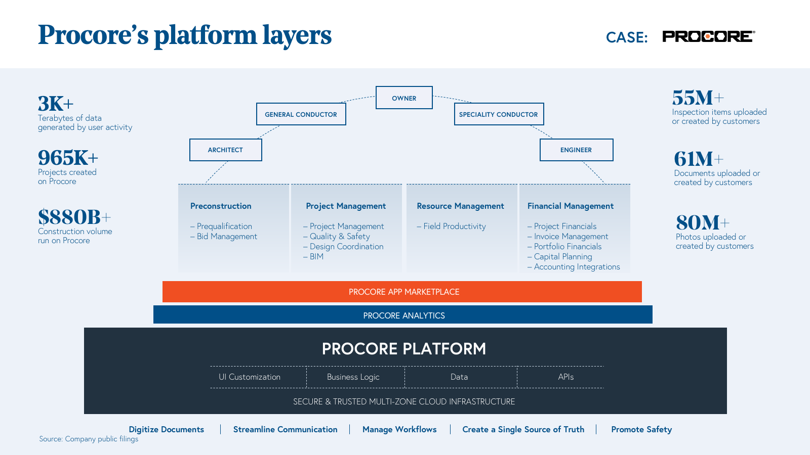 By 2019, user activity on Procore’s platform generated a staggering 3,000 terabytes of data with an average of 110 terabytes being added per month. Procore identified that its platform was accumulating a wealth of data that could be valuable to customers. In 2019, Procore acquired Construction BI and launched Procore Analytics, which helped customers capture value from Procore’s data layer through advanced business intelligence, including pre-built reports based on underlying data and the ability to develop custom visualizations and configurable dashboards.