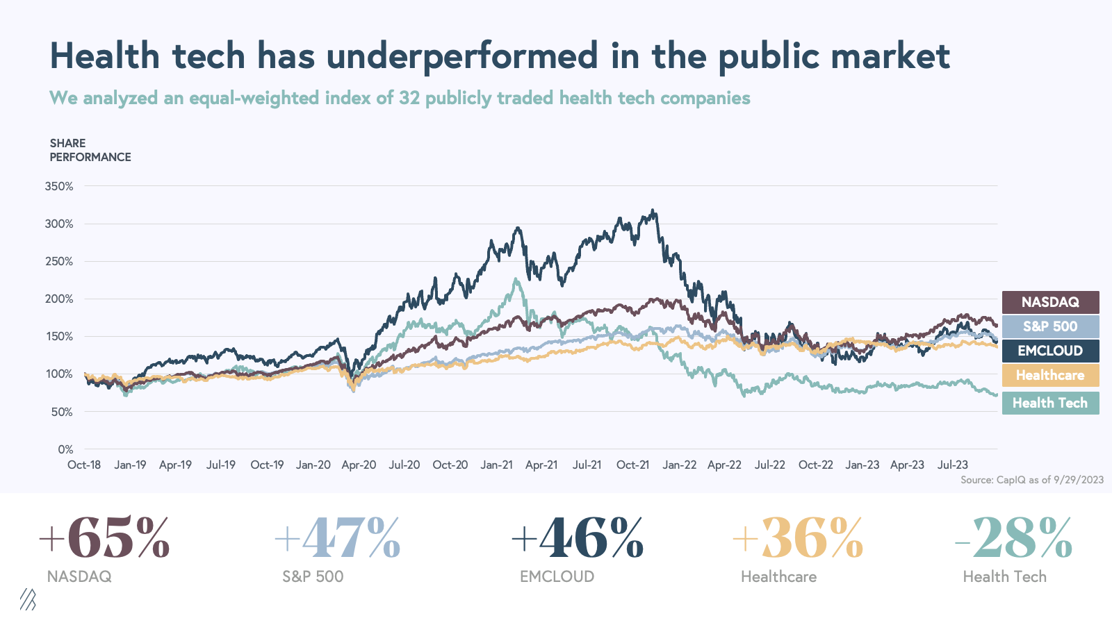 Beginning in February 2021, health tech experienced a major decline, correcting for the public market exuberance during the early stages of the pandemic. From the peak in 2021 to the trough starting in May 2022, on average, health tech stocks lost 60% of value. However, health tech stocks were not alone as high-growth companies generally were hammered in the public markets as evidenced by the emerging cloud software index declining at roughly the same rate.