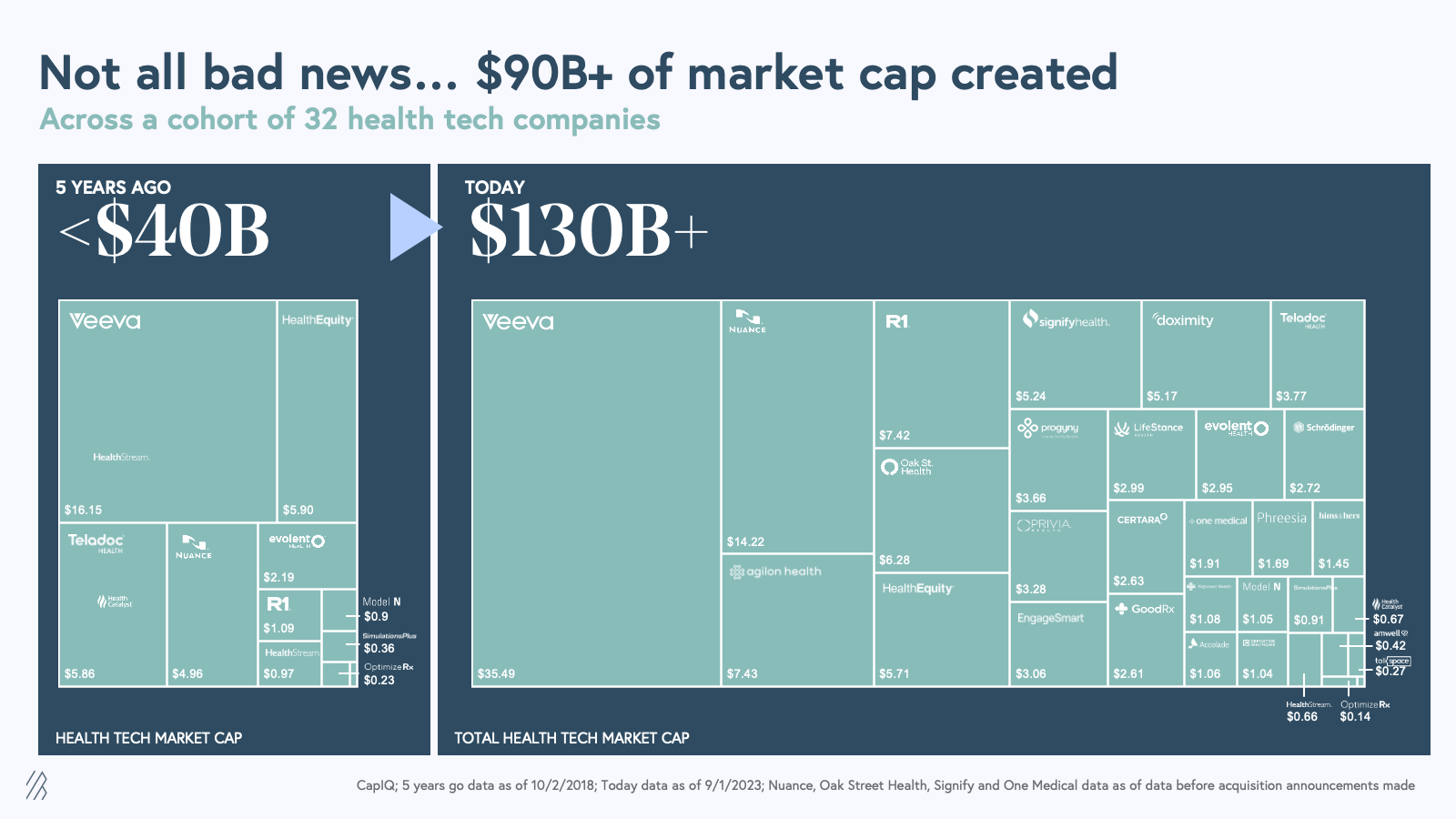 First, the health tech sector has generated over $90 billion in public market cap in the last five years. Notably, companies like Veeva, R1, Nuance, Model N, and Simulations Plus experienced significant growth in market cap since October 2018. In addition, most of this growth in market cap stems from a new cohort of 19 companies that have gone public during this period. Below is a picture of the 32 health tech companies in our health tech cohort we studied and their market sizes five years ago and today.