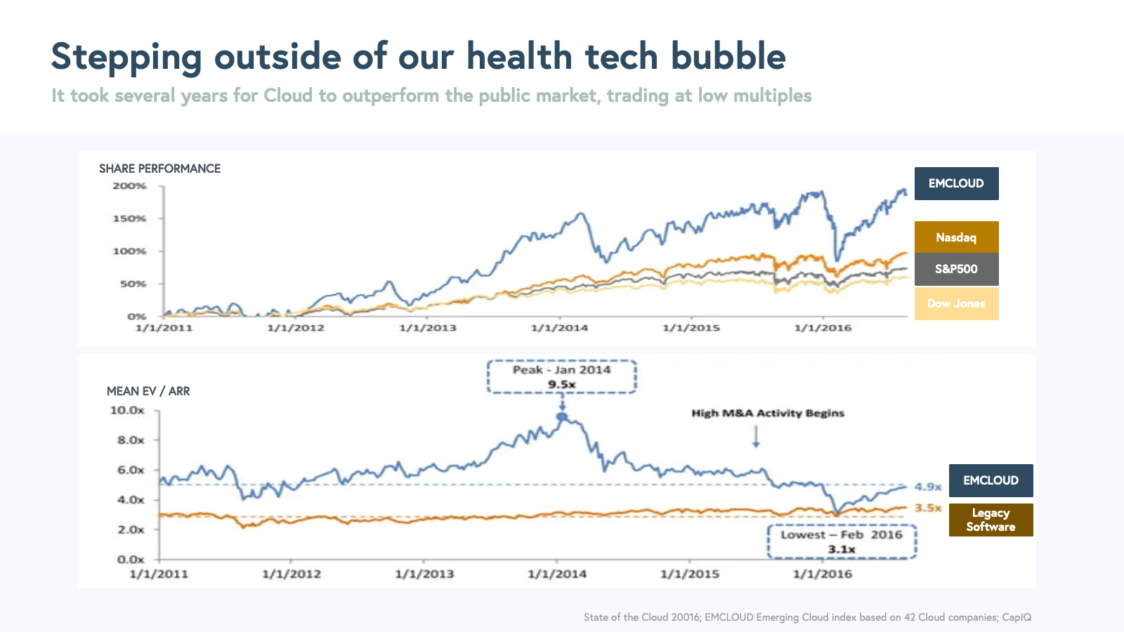 Third, the story of the rise of the cloud market (which made its public market debut a decade before the health tech industry) offers extra reason for hope—it took several years for the Emerging Cloud Index to surpass broader market indices, even through a bull market and subsequent corrections in 2014 and 2016. Additionally, in these early innings, cloud companies traded at relatively modest revenue multiples—averaging 4.9x over a five-year span beginning in 2011— and far from the peak of 27x EV/ARR in 2021. Today, Cloud has corrected and trades at about 7.5x EV/ARR multiples more in line with historical norms. A key question for the health tech industry is, “What multiples are the norm?”, as we are still in the early years of this journey. It takes time for the market to understand how to value these companies.