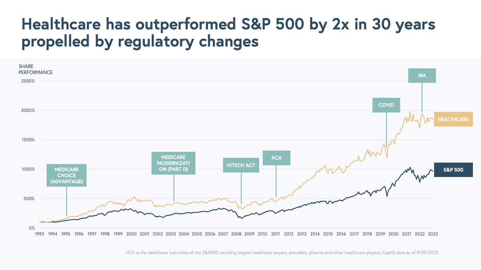 Let’s also not forget about the healthcare industry’s overall performance. The S&P 500 Health Care sub-index (HCX) has outperformed the overall S&P 500 by ~2x over the last 30 years. This index includes the largest healthcare payers, providers, pharma, and other healthcare players. While healthcare is generally thought to be more resistant to economic cycles, it appears that the real alpha in the HCX has occurred during times of regulatory change, such as the initiation of Medicare Advantage in 1995, the HITECH Act in 2008, the Affordable Care Act in 2010, and the COVID-19 pandemic in 2020.