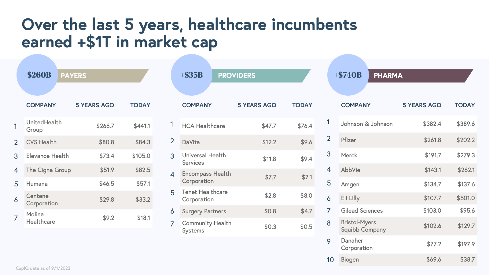 We believe regulation has been the bellwether of our industry, with the ACA and HITECH Act serving as stepping stones to the birth of many great health tech companies. Yet the performance of the HCX index reveals that the largest healthcare incumbents have accumulated over $1 trillion in market cap in the past five years, with pharmaceutical companies leading the pack, followed by healthcare payers and providers. This raises the question, why has most of the value in the healthcare industry accrued to incumbents? And how do we make sure the health tech and innovation ecosystems thrive alongside incumbents?