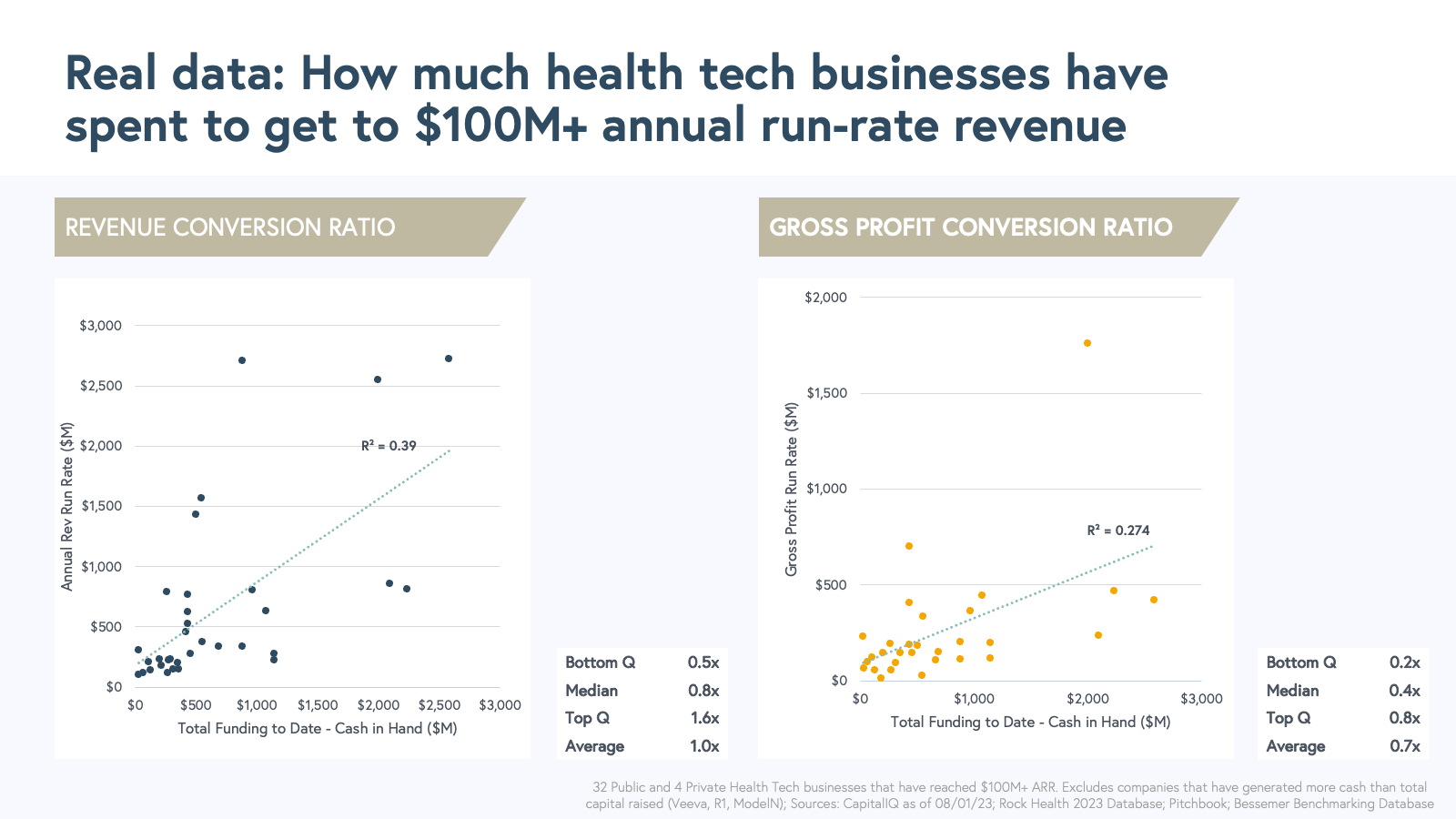 We examined 36 health tech companies with over $100 million in annual revenue run rate—the 32 publicly traded companies we mentioned, as well as four private companies—to understand capital efficiency. Compared to traditional SaaS companies, the median health tech company needs more capital to reach the $100 million revenue milestone. However, on average, the revenue-to-capital burned ratio is similar at 1x.