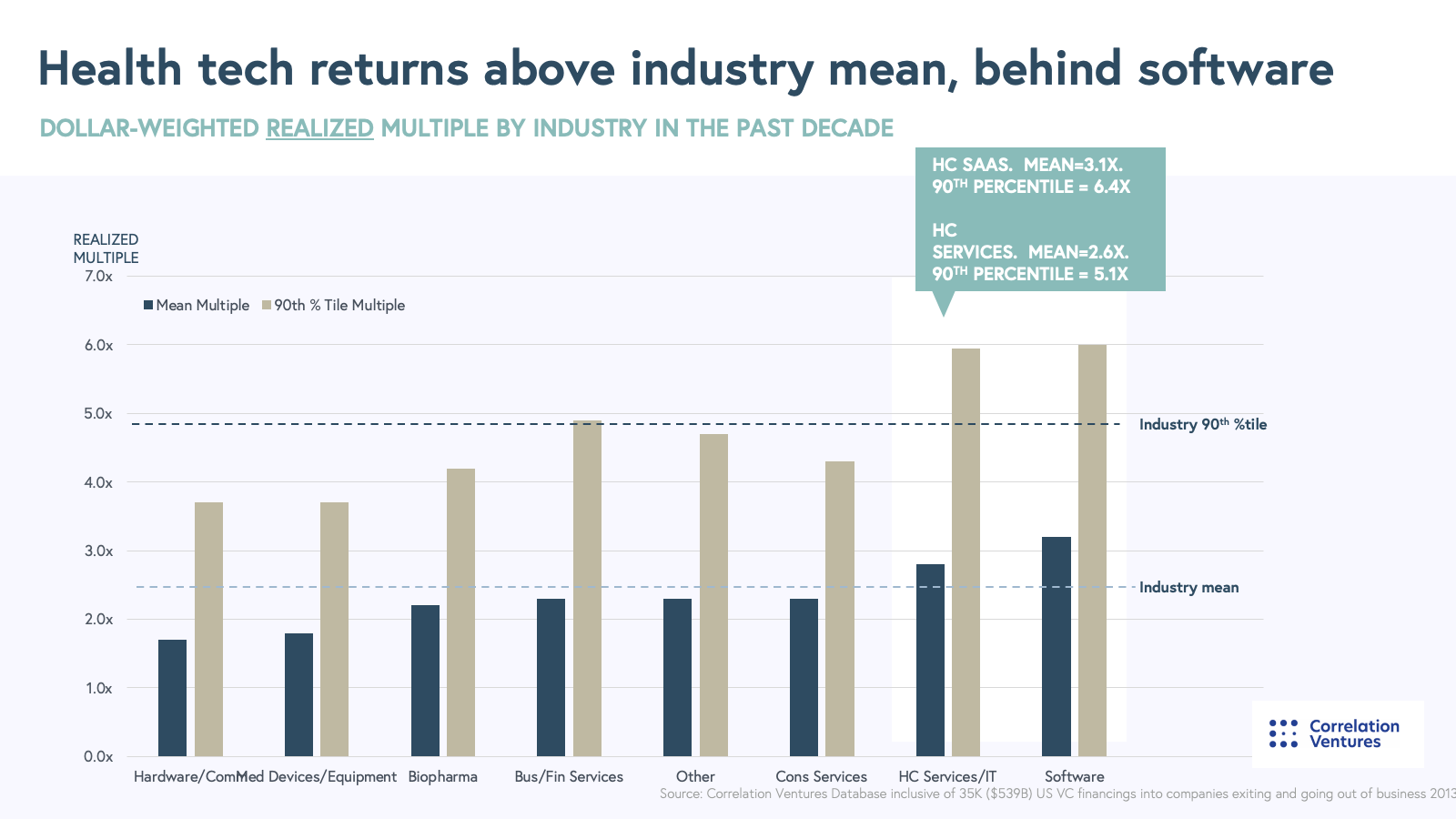 Using data from 35,000 VC financings across industries that our colleagues at Correlation Ventures assembled, we looked at dollar-weighted realized returns over the past decade as a proxy to understand investor returns in health tech companies. We see that health tech is the second best performing sector just behind Software. Healthcare SaaS companies have average returns of 3.1x (90th percentile = 6.4x), and healthcare services businesses have average returns of 2.6x (90th percentile = 5.1x).