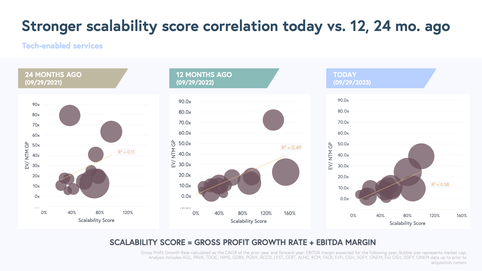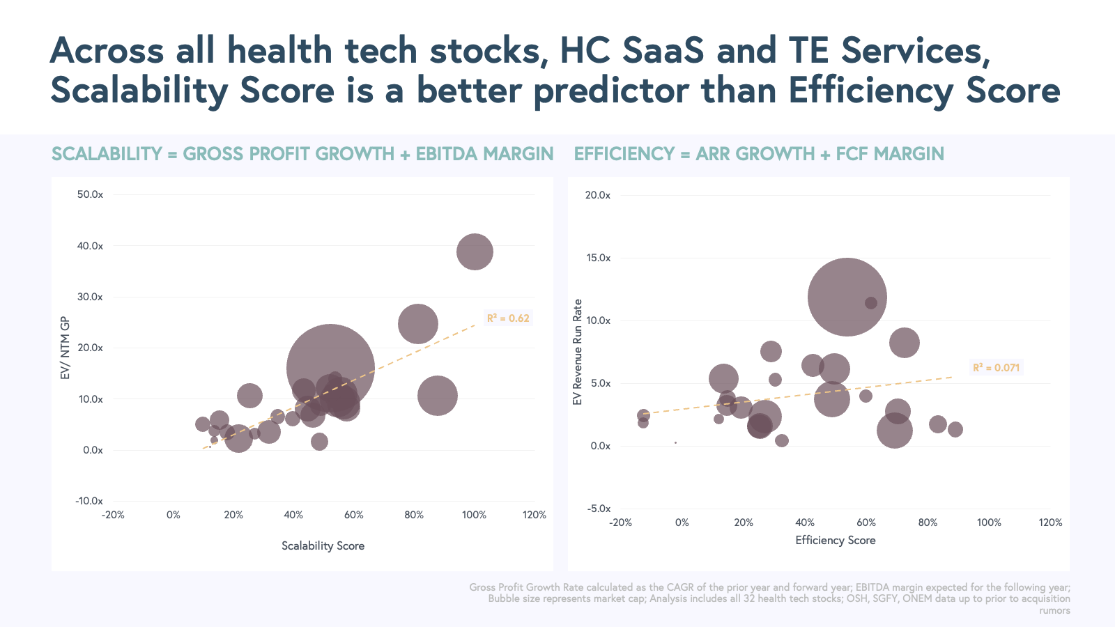 We also observe a strong relationship between valuations and scalability scores when looking at both healthcare SaaS and tech-enabled services, away from the traditional efficiency scores used in SaaS. As a reminder, efficiency score is calculated the sum of growth in revenue run rate and free cash flow margin.