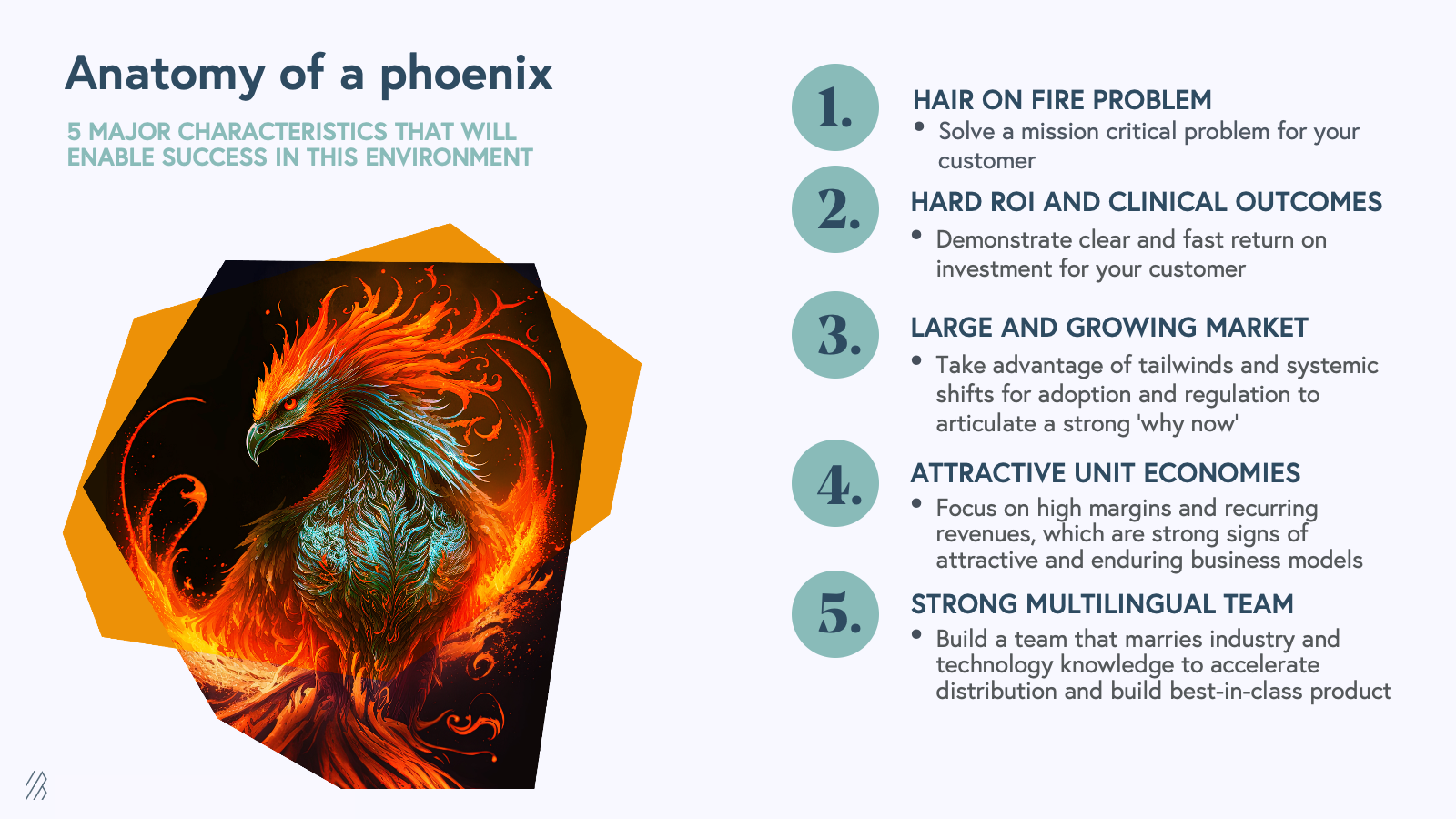 For health tech to reach the fourth stage in its hype cycle, the “slope of enlightenment,” the sector needs multiple startup success stories with sustained outcomes and scalable business models. Like phoenixes rising from the ashes, there will be several resilient companies with strong business models, sound leadership and just the right idea to come out on the other side of this market lull. So who is making it to the other side and who will be left behind in the digital health graveyard? We hope that the growth of efficient, resilient health tech businesses in the private markets will lead to a rise of new IPOs over the next few years. Let’s deep dive into what the phoenixes will have in common.