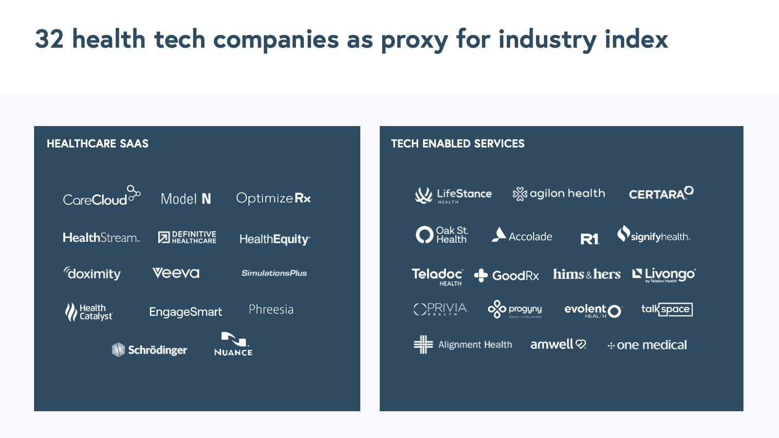 To measure health tech market performance, we studied a cohort of 32 publicly traded health tech companies, including both healthcare SaaS and tech-enabled services businesses, as part of our benchmarking efforts. (Read our previous health tech benchmarking reports here and here.)
