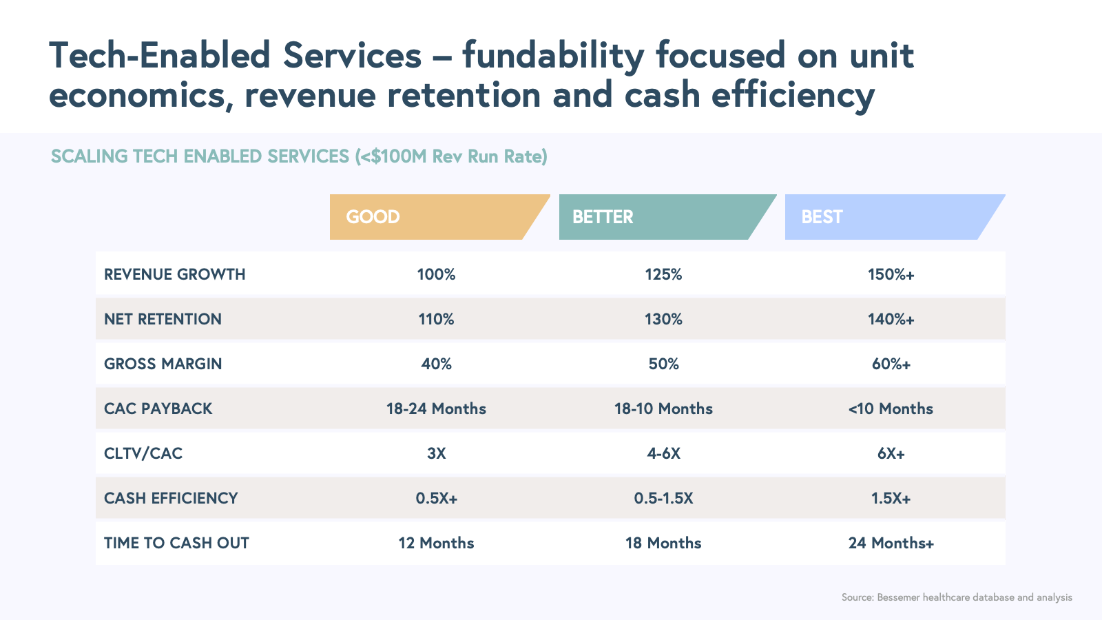 The bar is now higher to successfully raise funding. Below is a summary of “fundability” benchmarks for each business model. For more details about your company stage please review our Scaling Health Tech Businesses to $100M+ article. (We encourage companies to subscribe to Atlas and follow us on social media so you can be the first to know about our sub-sector benchmark deep dives coming out later this year.)