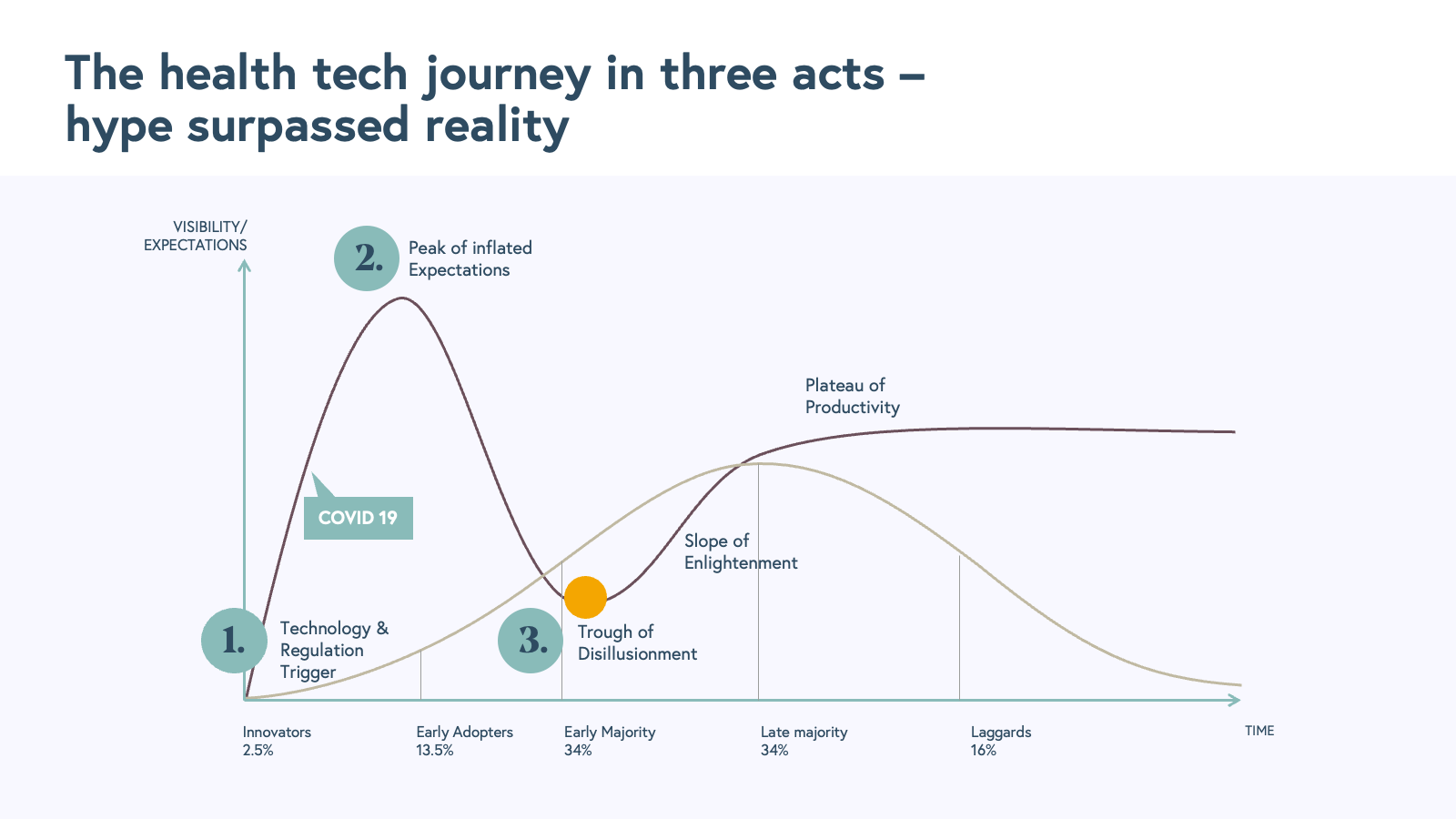 Between 2018 and 2023, health tech company stocks rose, fell, and began to stabilize in a new valuation environment. This behavior followed three phases typical to a hype cycle: (1) the technology and regulation trigger, (2) the peak of inflated expectations, and (3) the trough of disillusionment.
