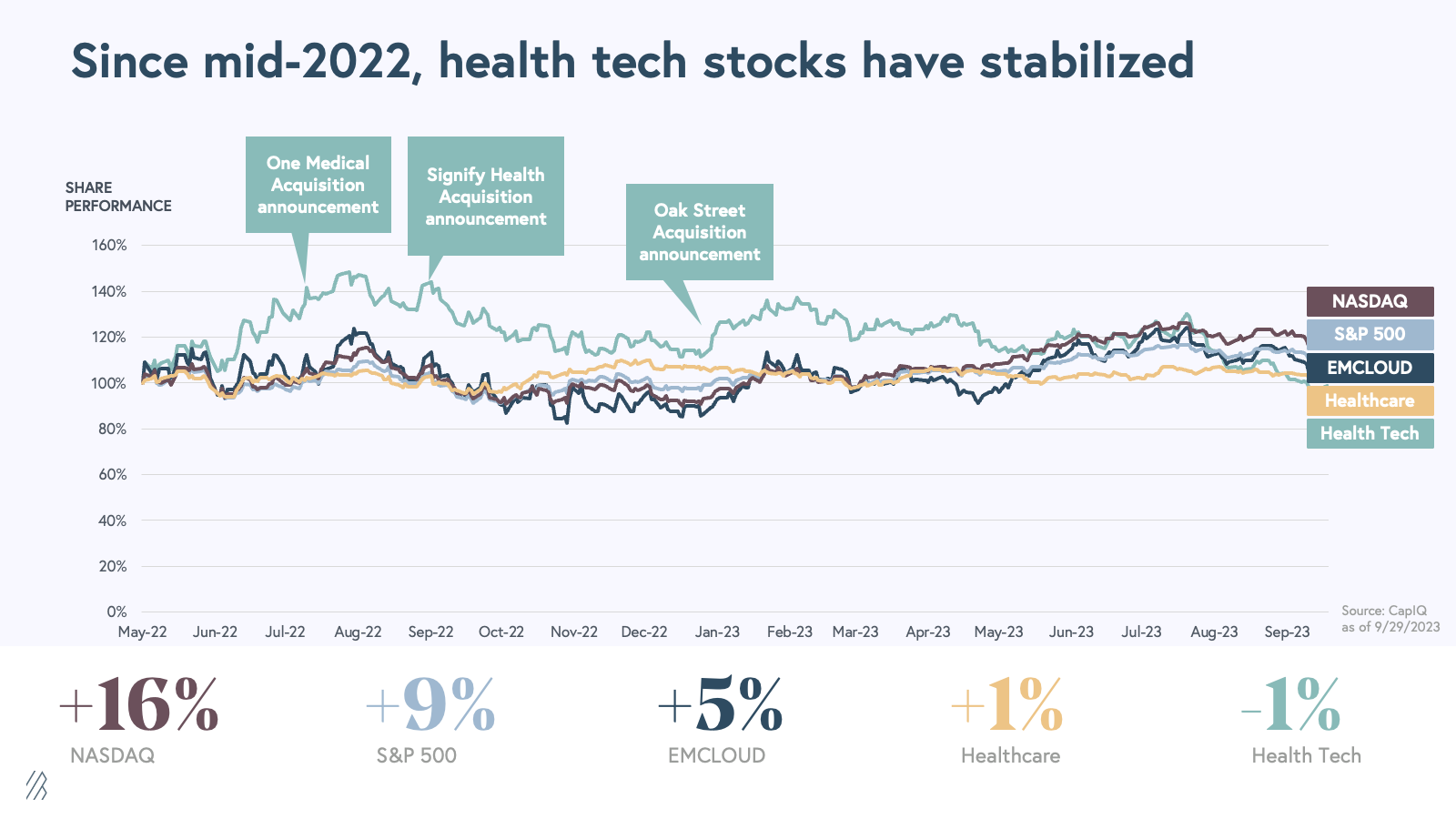 Since hitting bottom in May 2022, we’ve seen more stable performance across health tech stocks. The health tech cohort gains during summer of 2022 and January 2023 were mainly driven by announcements of relatively large acquisitions in the health tech sector, including Amazon’s $3.9 billion acquisition of One Medical, CVS Health’s $8 billion acquisition of Signify Health, and CVS Health’s $10.6 billion acquisition of Oak Street Health. We believe we are currently in the health tech public market’s trough—dare we call it the bottom of the market (!)—and we have seen health tech stocks stabilize, mirroring the recent rebound of other major market indices.
