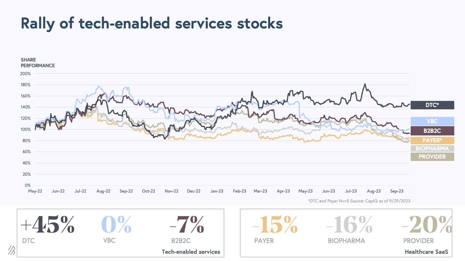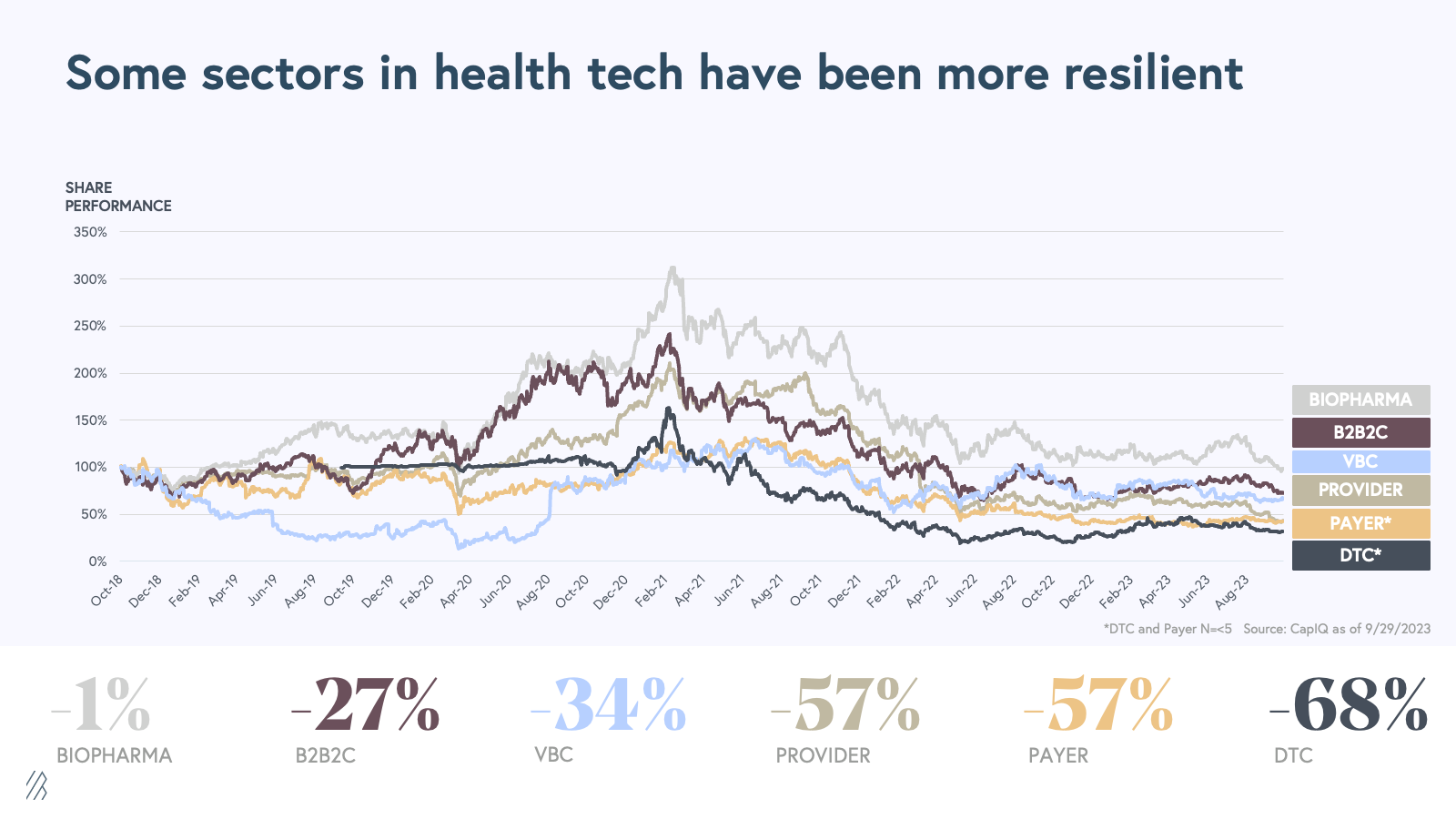 What health tech sub-sectors have been the most resilient in the public markets? We split the 32 stocks in the health tech cohort: we categorized healthcare SaaS into Payer, Provider and Biopharma sub-sectors and tech-enabled services into B2B2C, Value-Based Care (VBC), and Direct-to-Consumer (DTC) (See our methodology for a list of stocks in each sub-sector). In healthcare SaaS, the Biopharma sub-sector only declined 1% whereas Payer and Provider software declined 57% in value. In tech-enabled services, B2B2C only declined 27% whereas DTC lost 68% of value.