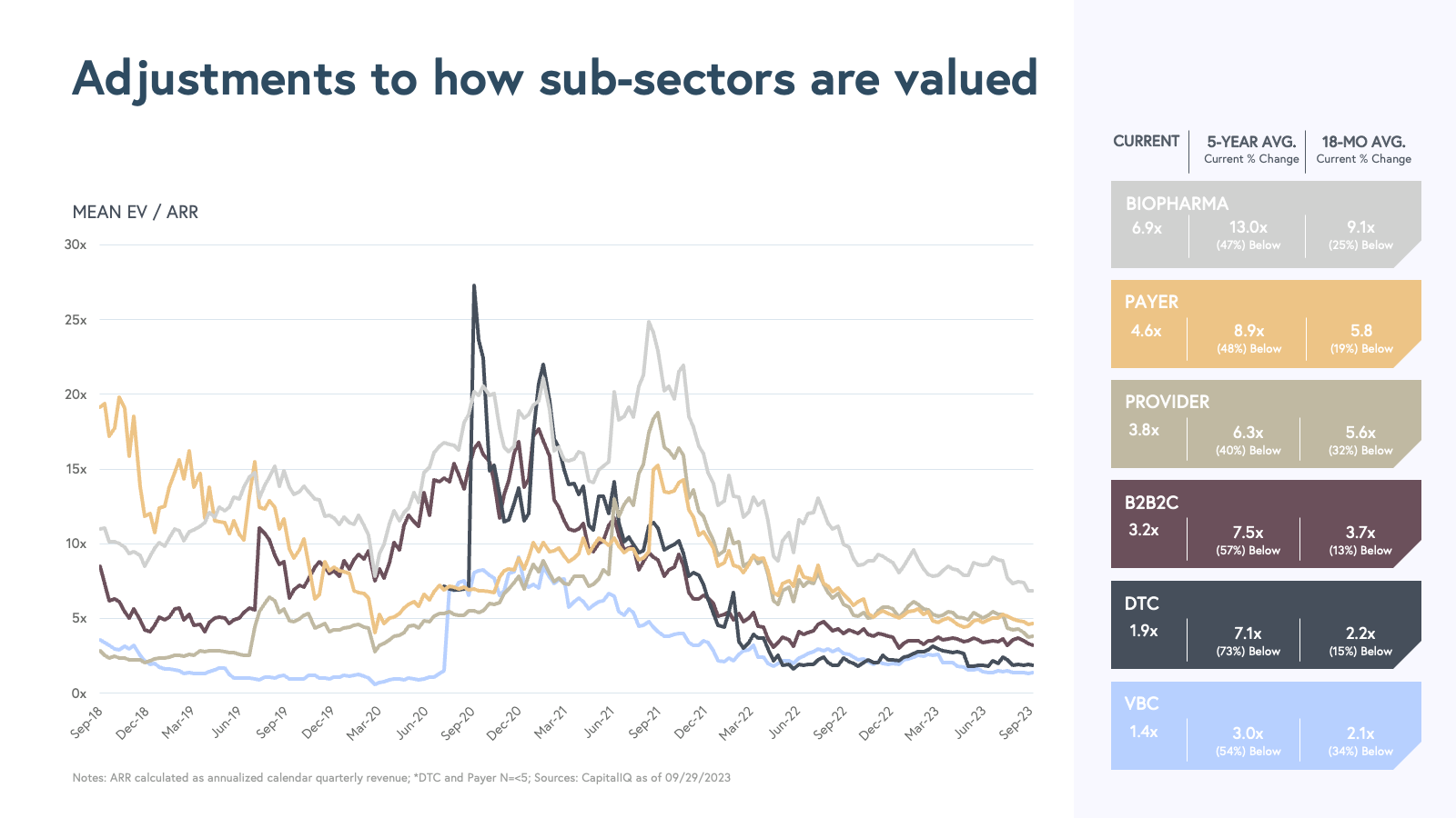 If we look at the sub-sectors by revenue multiples, we see a wide range, with Biopharma commanding the highest valuation multiples, and VBC and DTC the lowest. Given the varied unit economic profiles of the tech-enabled services businesses, we are finally moving away from revenue multiples.