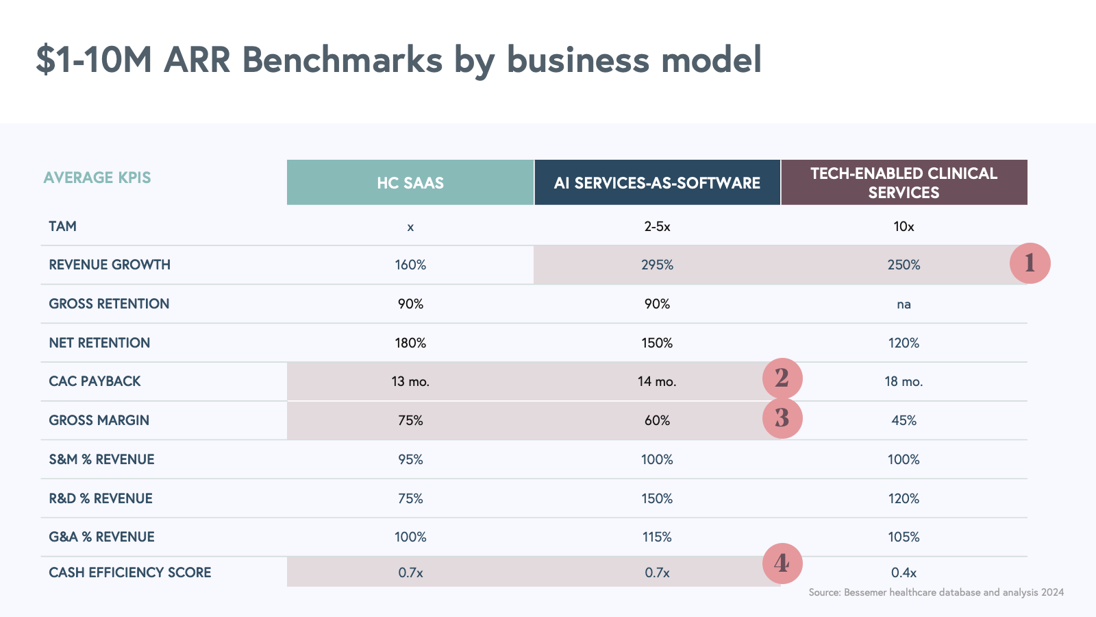 AI Services-as-Software average KPIs borrow from the best metrics across Healthcare SaaS and Clinical Services. We particularly want to highlight four learnings: