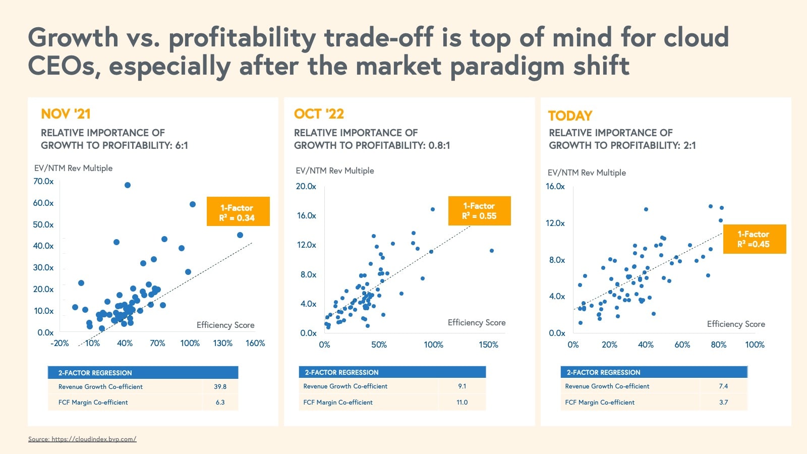 The market pullback ushers in a paradigm shift from the age of growth-at-all-costs to the age of efficiency. Valuations for cloud companies are currently more tightly coupled with efficiency scores than absolute growth. We observe that this efficiency premium on valuation is material with “Rule of 40+” BVP Cloud Index companies trading ~1.7x higher than less efficient peers.