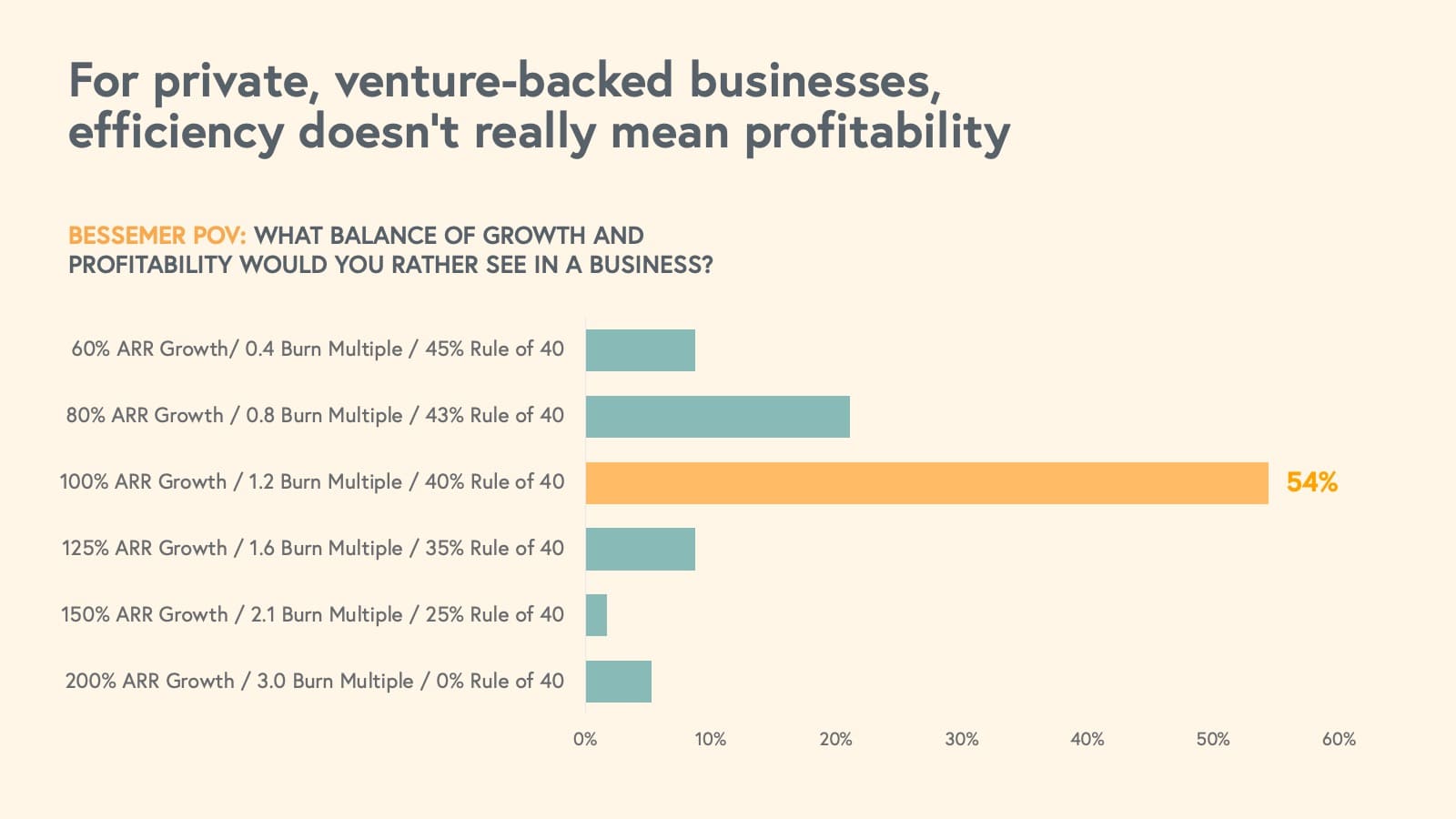 What about private market sentiment? To answer this, we surveyed the Bessemer investment team to understand what should be the “ideal profile” of growth vs profitability for startups. Triple digit growth is still the resounding aspirational goal, but now layering on the Rule of 40 benchmark as a north star. The ideal growth profile for SaaS businesses looks like 100% Revenue Growth and a 1.2X Burn multiple. What this means is that startups do not need to solve for cash flow break-even right away as they should still be investing in growth, but this growth should be at optimal costs, not growth-at-all-costs.