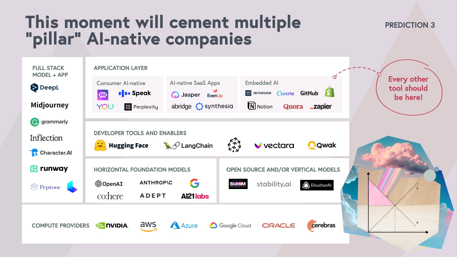 As the ecosystem explodes, entirely new categories of products and services are emerging around AI capabilities. AI-native businesses are being built and designed from the ground up with AI at the core of the product offering. And we’re seeing new leaders rise in consumer and enterprise categories, as well as the emergence of a new layer of developer tools and enablers that make it easier to build and leverage AI. For example, Jasper defined a new model for content creation, pioneering the market for AI generated copywriting. Likewise, Perplexity is reinventing search, creating a new paradigm around knowledge discovery and information access.