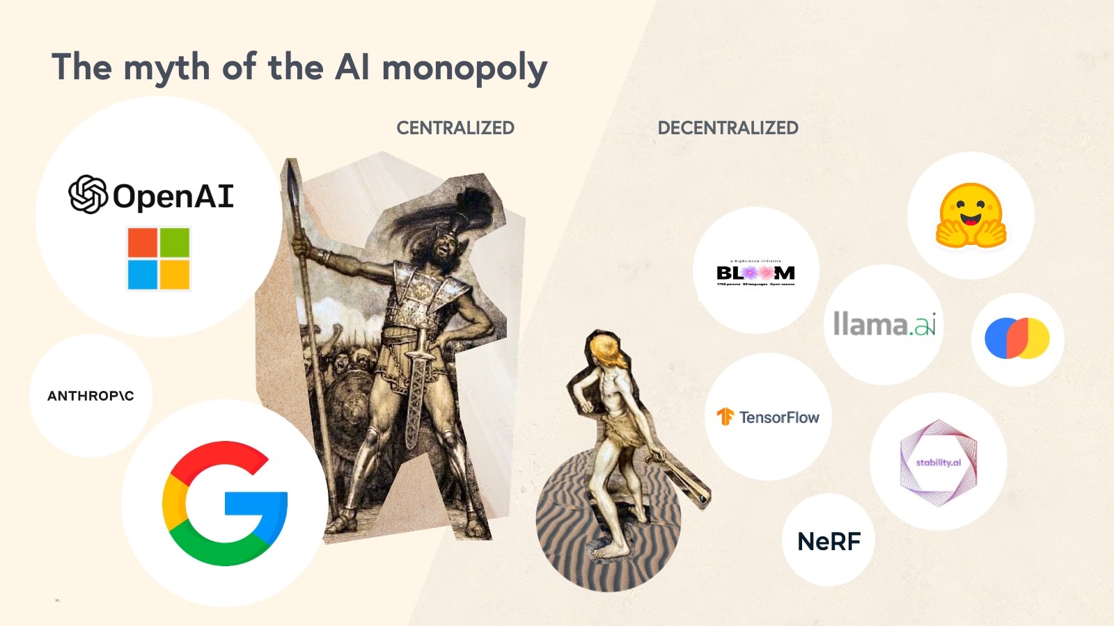 A David and Goliath story is shaping the core of the AI market. To many it appears an oligopoly of a few key players, including OpenAI, Google, Microsoft, and Anthropic, is solidifying to capture the bulk of the developer activity generated by this AI wave. But the long tail of AI models and enablers is blooming, in part driven by the open-source community. Some open source models like stable diffusion and whisper are at times outperforming centralized players, particularly in areas like speech-to-text and image. Training AI models is also getting cheaper, leading to the emergence of a fragmented ecosystem of low-cost, smaller, or verticalized models.