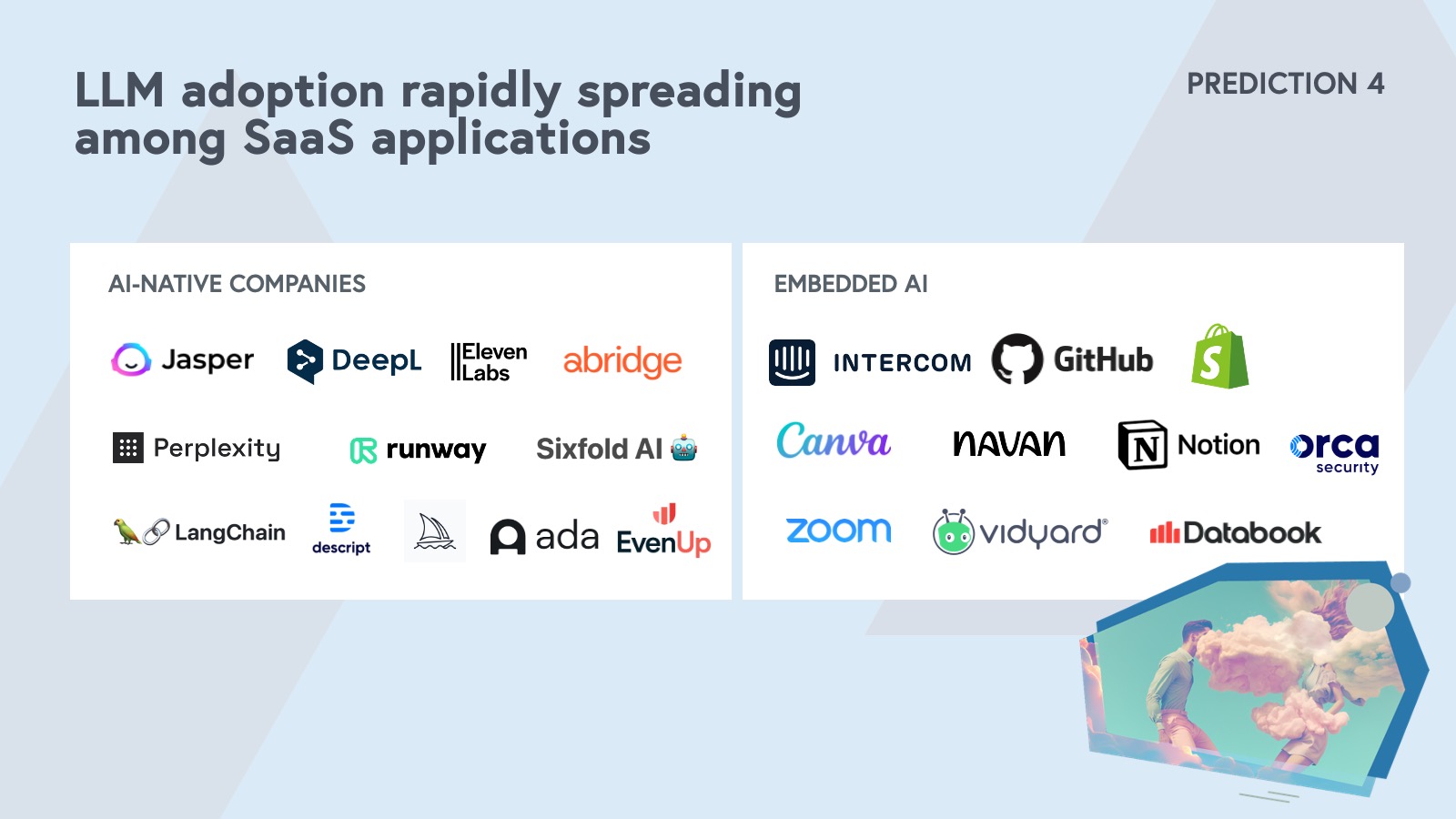 As the world continues to run on the cloud, we’re also on the brink of the next platform shift that’ll accelerate generations of innovation and value creation. The knowledge and information economy will be defined by artificial intelligence—both for AI native businesses and SaaS applications. More on our AI predictions below.