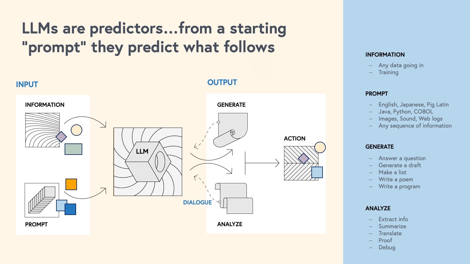 An LLM is a giant predictive machine—trained on massive sets of information (text languages, coding languages, images with descriptions, weblogs, other datasets) and optimized to predict the information most likely to follow a starting prompt.