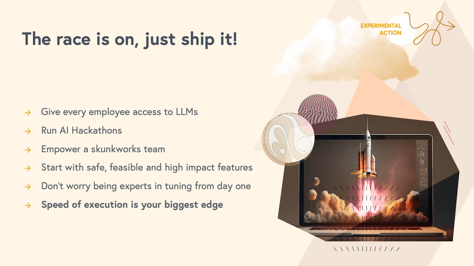 Remember, in the short term, speed of execution is the most important factor. Don't worry about cost or long-term differentiation. Start with off-the-shelf tools until you can prove out differentiating use cases, and then assess where you need dedicated ML talent. Being agile is essential for survival in this rapidly-evolving landscape.