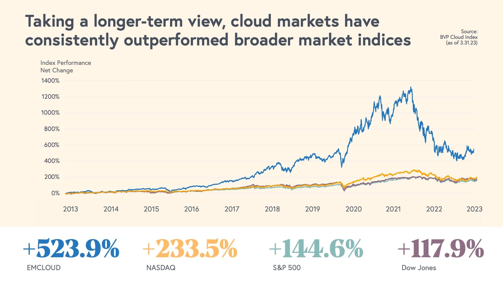 Despite the challenges in the cloud economy, there are many silver linings. Taking a long-term perspective, cloud markets have consistently outperformed other broader market indices. This is a testament to the power of the cloud model—one of the most attractive business models to ever be invented. Even in the last 12 months, with seemingly never-ending challenges, the average BVP Nasdaq Emerging Cloud Index growth rate was still more than twice the average S&P 500 company growth rate. In just ten years (2013-2023), the total public cloud market capitalization has grown from $283 billion in March of 2013 to $1.3 trillion in March of 2023. Today the public cloud market is still above pre-pandemic levels.