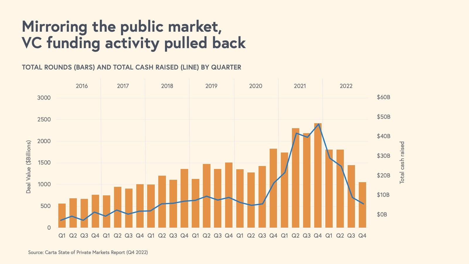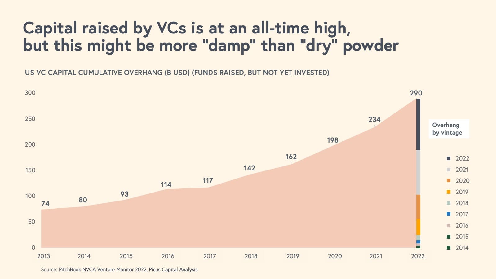 At the same time, venture dollars raised have reached an all-time high; however, despite the ecosystem having a lot of “dry” powder available, some of these are more "damp" dollars that are earmarked as reserves to support existing portfolio companies.