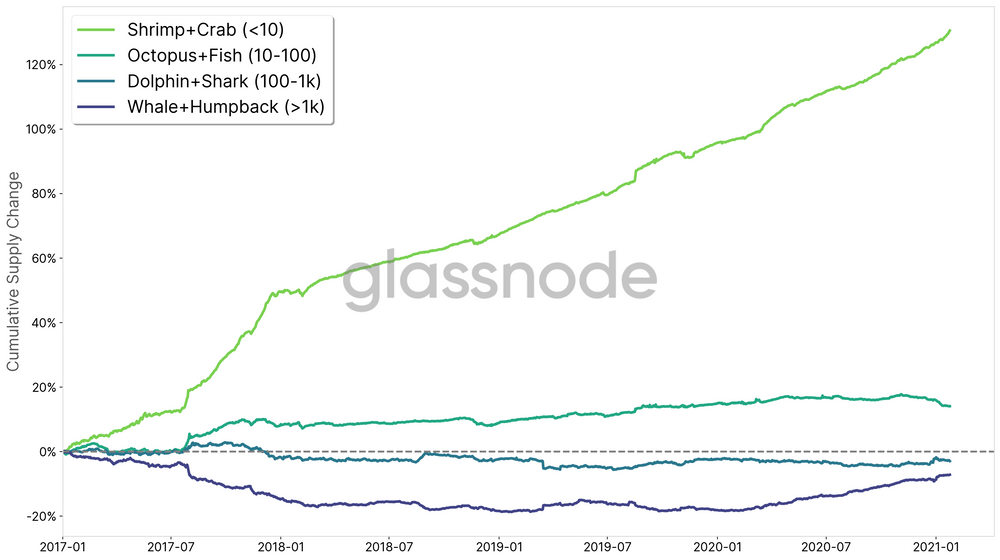 Per Glassnode's research (published in mid-2021), “whales” (1k-5k BTC) and “humpbacks” (>5k BTC) together control ~31% of the BTC supply, representing institutions, custodians, OTC desks, and others. However, the study also examines the “relative change in supply across these entity sizes” with the smallest entities (shrimps and crabs) increasing their holdings by 130% since 2017 and at 5% and 9% collectively, they are not insignificant. At the same time, large entities (dolphins, sharks, whales, and humpbacks) have decreased their BTC ownership by 3% and 7%, respectively: