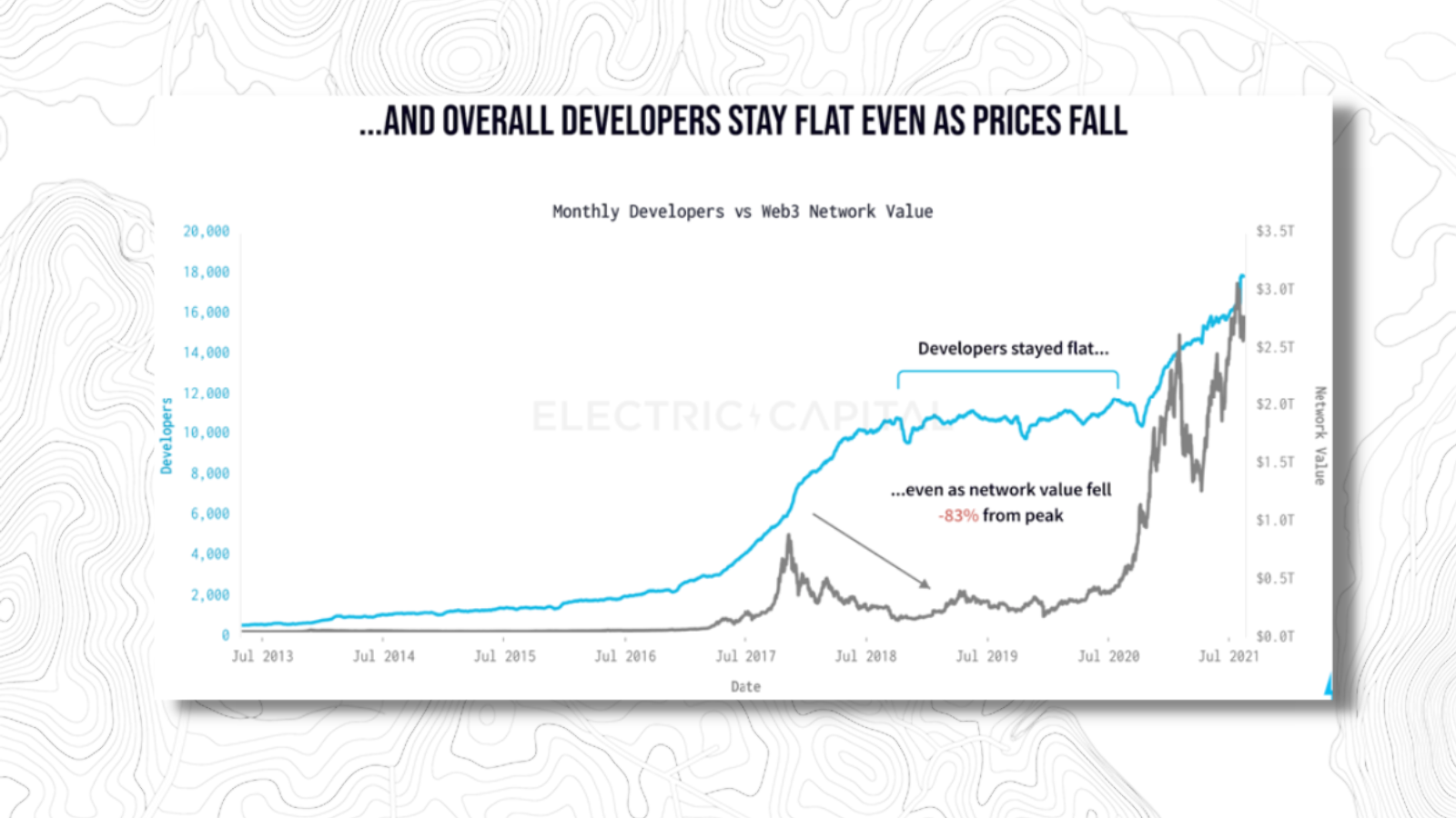 We believe the biggest counterpoint to general crypto naysayers can be found in the data around founder and developer activity. According to Electric Capital’s 2021 Developer Report, web3 developers are at an all-time high and growing faster than ever. In 2021, 18K+ monthly active developers committed code in open-source crypto and web3 projects, with 34K+ new developers committing code that year, the highest in history. Most interestingly, the overall number of developers stayed flat even as prices fell, suggesting that while newfound interest may initially be driven by speculation, there is a genuine commitment to the category that remains even when the tides run out.