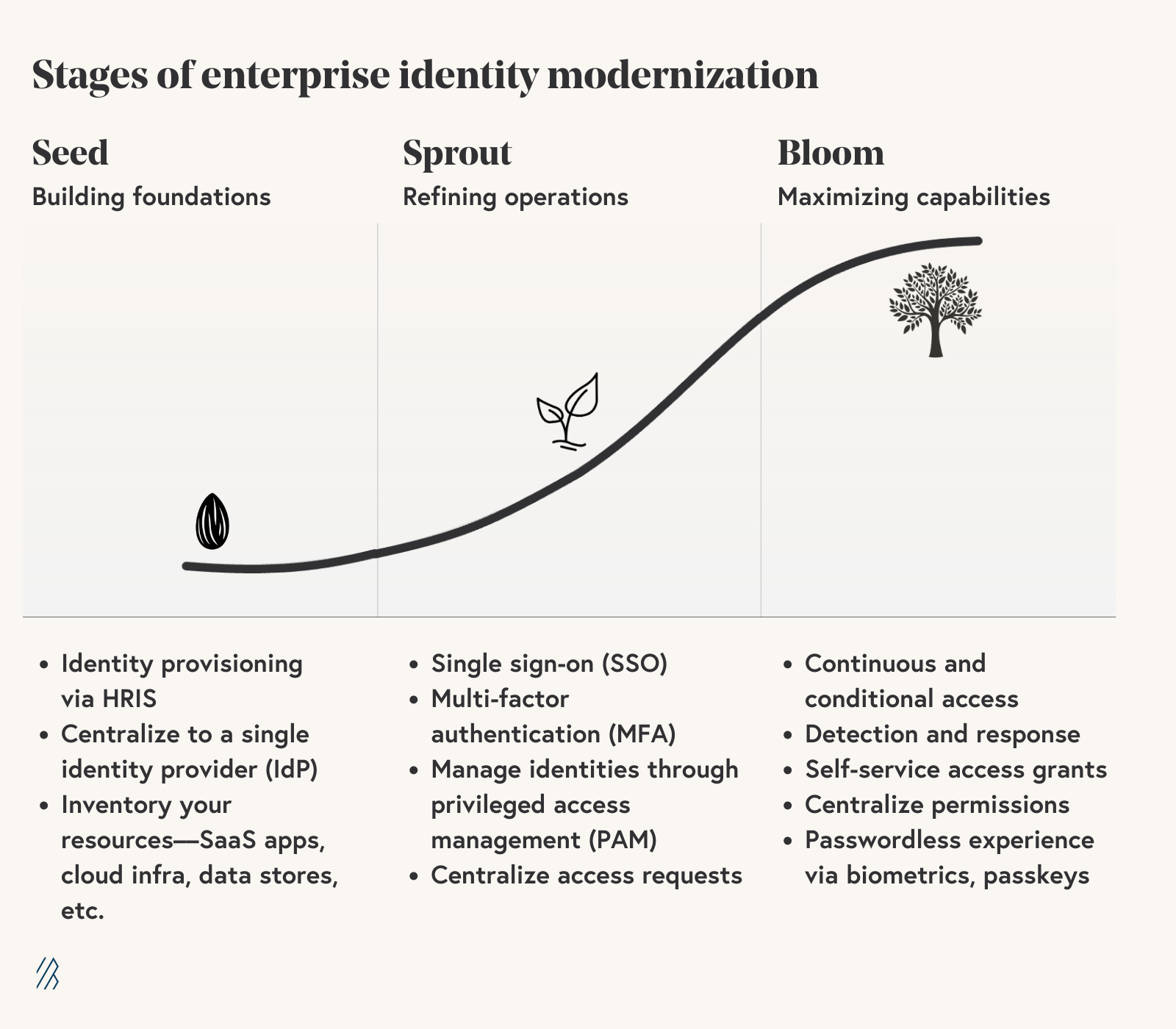 Just like the Seed, Sprout, and Bloom phases, it’s important to break down any cybersecurity modernization project into incremental stages—this implementation structure helps make the changes more concrete and approachable, and each individual action contributes to a long-term strategy. For example, as a founder or CISO, you might plan on first making a few tactical shifts as your organization commits to enterprise identity modernization.
