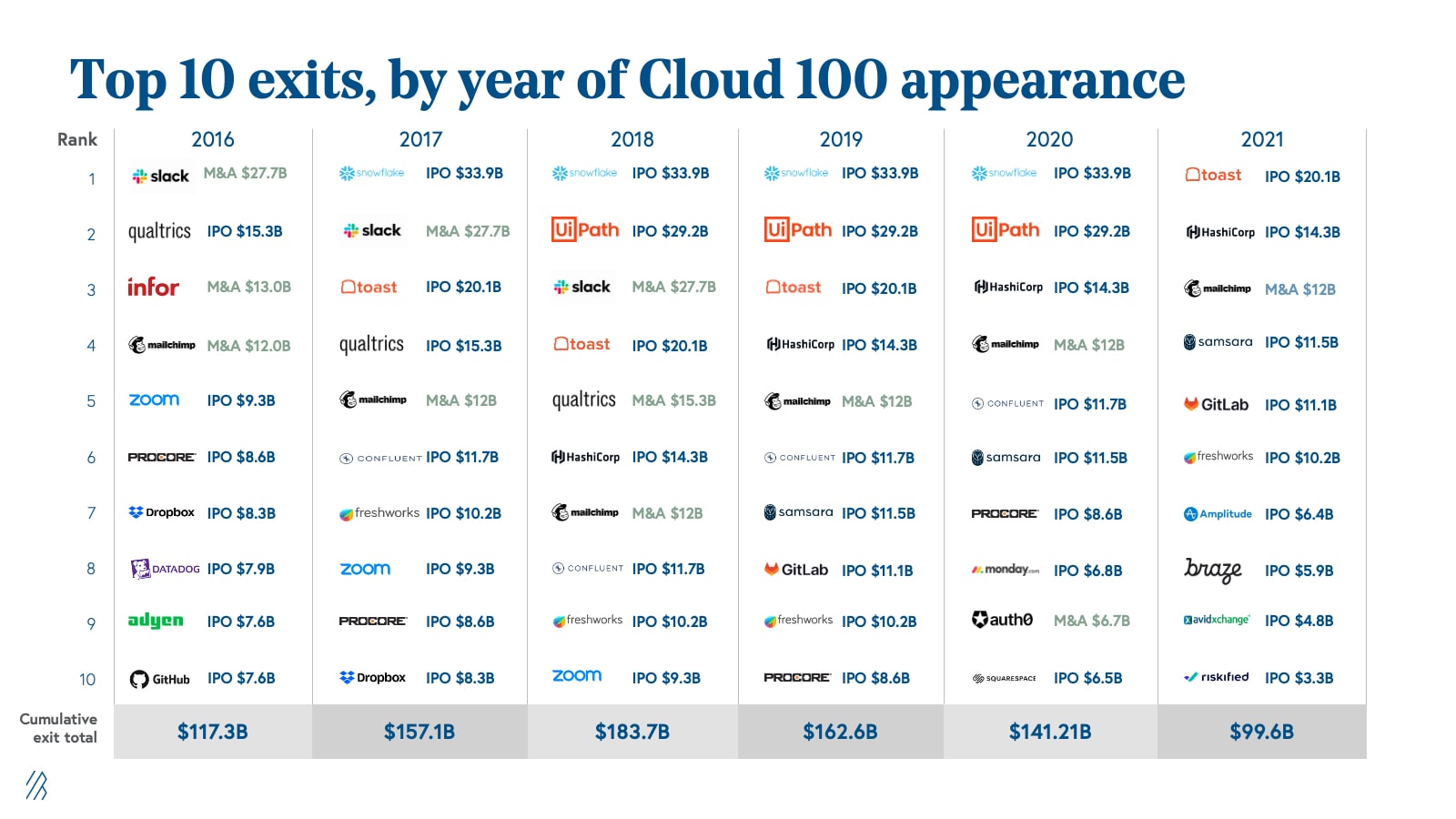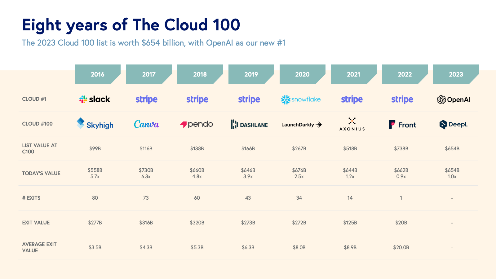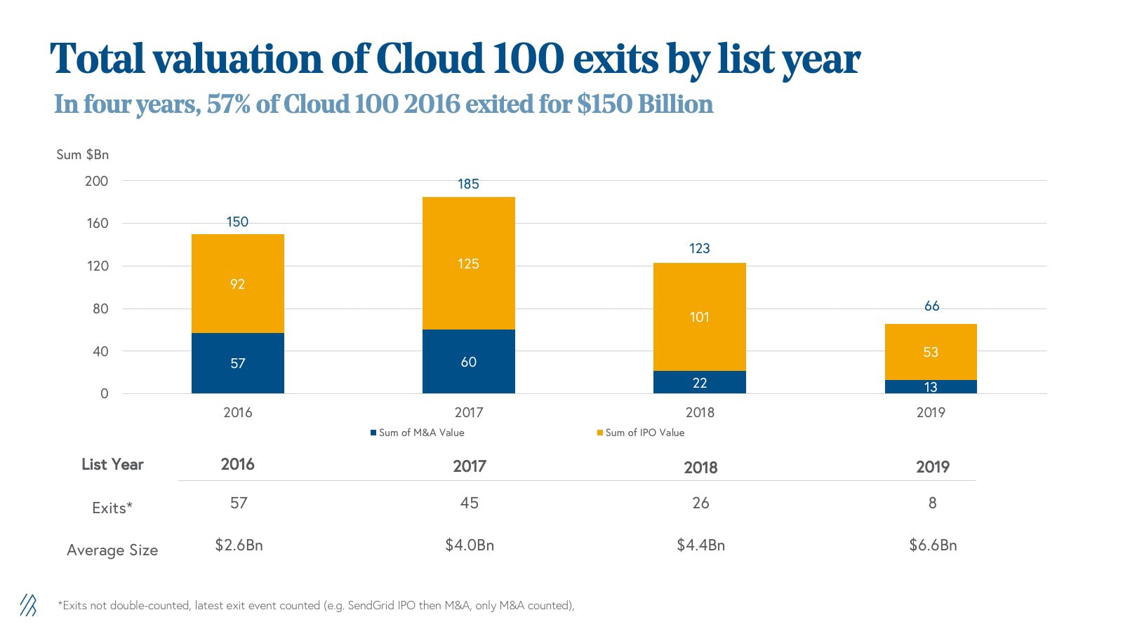 The exit path for Cloud 100 companies continues to validate the list’s quality. Fifty-seven percent of the Cloud 100 from 2016 has exited for an average of $2.6 billion and total of $150 billion, including some household names like Slack, Dropbox, Okta, and Eventbrite.