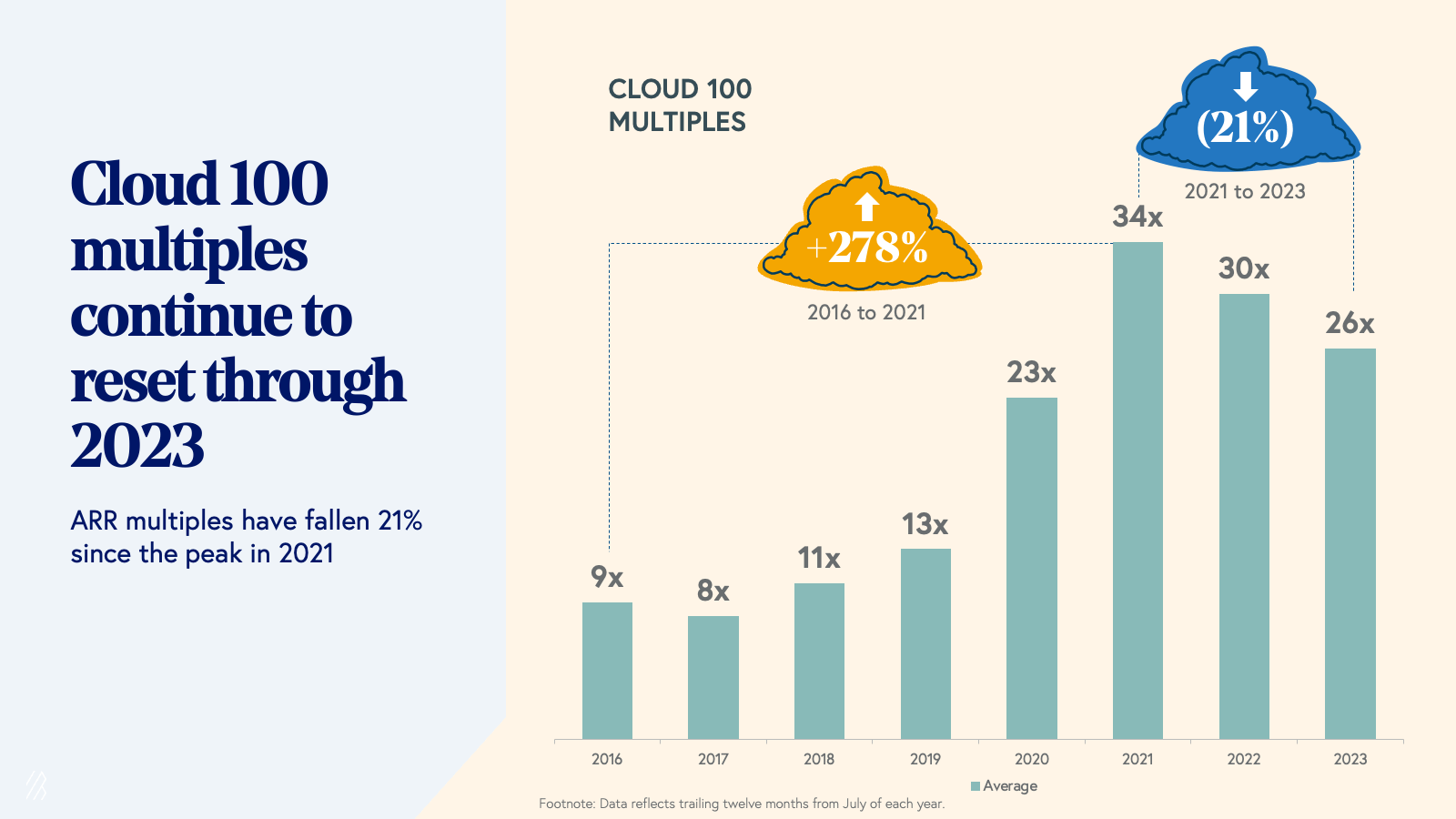 - Private cloud multiples are now reflecting the impact of the public market reset that began at the start of 2022. The average Cloud 100 multiple decreased for the second year in a row, down to 26x from 30x last year, representing a 21% decline since the 2021 peak of 34x.