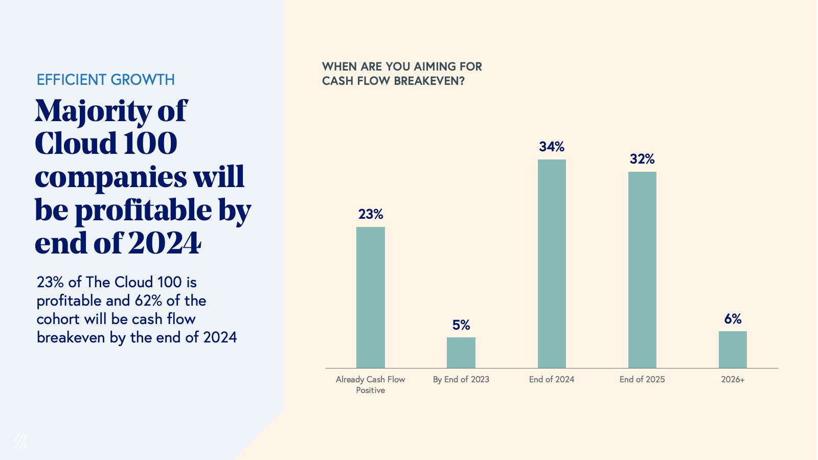 While the IPO window has been frozen over the last year-and-a-half, there are signs of life. Companies are beginning to test the waters—non-cloud companies like restaurant chain Cava have gone public over the last two months, and there are indications that shoemaker Birkenstock and chip maker Arm will go public as early as September. Combined with slowing inflation and the market’s indication that it has priced in the impact of recent interest rate hikes, the capital markets have become more predictable. We anticipate that this will lead to many Top 10 Cloud 100 companies soon making public exits and paving the way for others. It has been reported that companies such as Stripe, Klaviyo, Talkdesk, and Rubrik, have been ramping up IPO discussions and preparations.