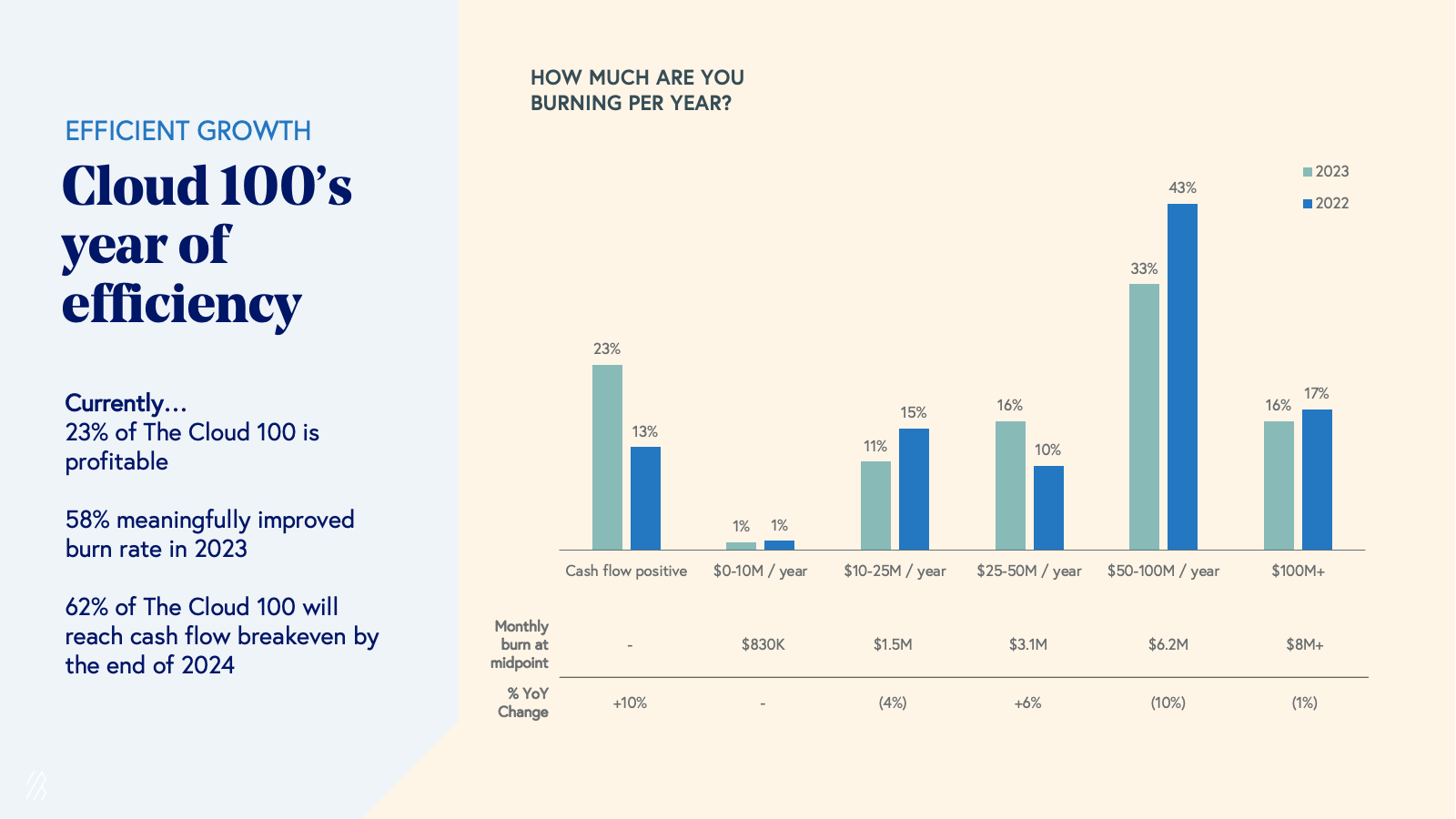 Without question, AI is fundamentally reshaping how the best cloud companies grow, scale, and compete. In this tenth edition of the Cloud 100 Benchmarks report, we reveal the critical data points behind this shift, from record valuations and growth rates to compressed time-to-scale milestones and category-defining multiples. You’ll find benchmarks across all ten categories of this year’s list, plus insights on how AI is bending the curve on the journey to $100M+ ARR and beyond. For founders and investors alike, this report serves as a roadmap for what it now takes to lead and win in the cloud AI age.