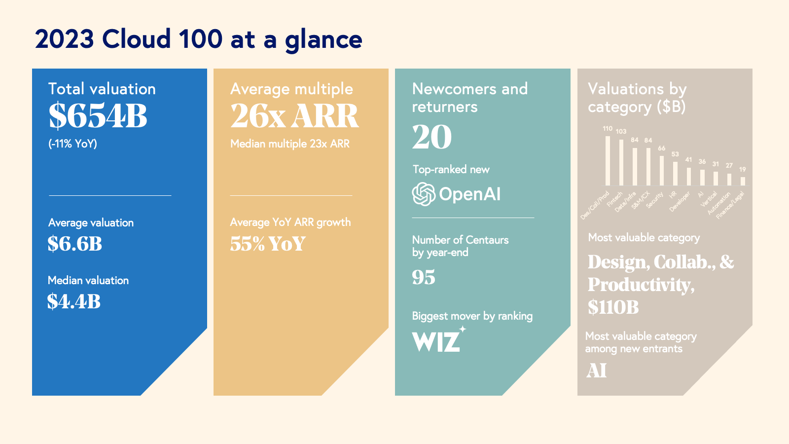 - We introduced AI as a new standalone category this year, with all 5 AI-native companies in the category making their debut on the Cloud 100 list this year. While the core AI category represents $36 billion in total equity value, we’ve seen the impacts of AI across almost every category; in particular, nearly every company in this year’s leading Design, Collaboration, and Productivity category has openly embraced integrating AI into their product capabilities.