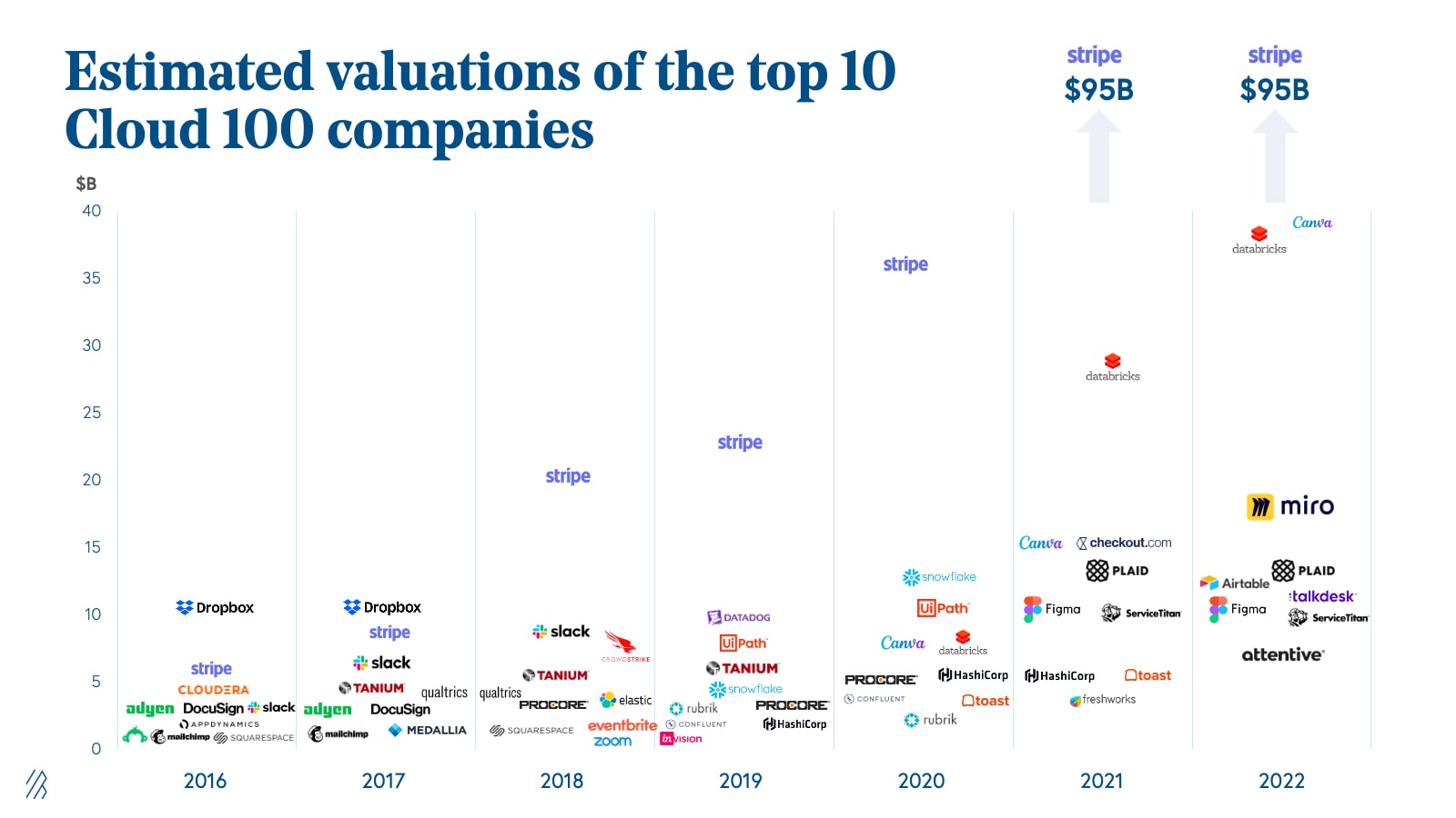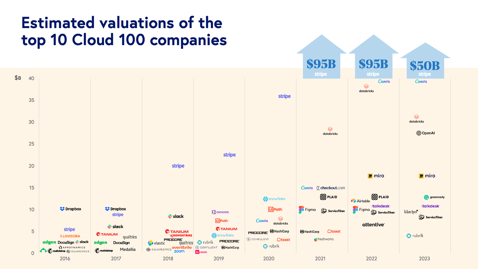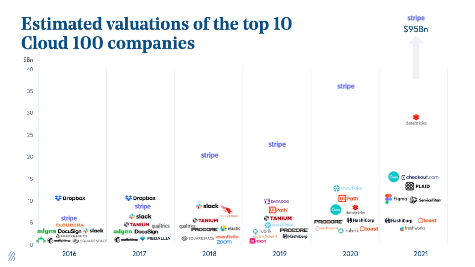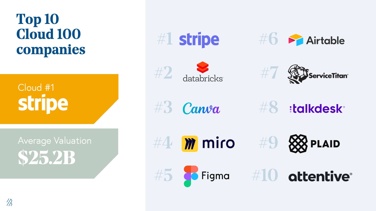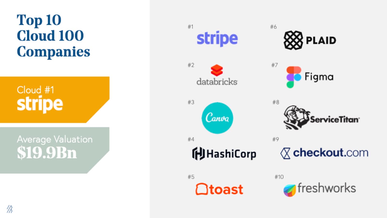 The Top 10 Cloud Companies represent almost $200 billion of equity value alone. Stripe, which was unseated by Snowflake in 2020, secured its number one spot once again and is the top-ranked cloud company, valued at $95 billion. Joining Stripe on the top ten list includes Databricks (#2), Canva (#3), HashiCorp (#4), Toast (#5), Plaid (#6), Figma (#7), ServiceTitan (#8), Checkout.com (#9), and Freshworks (#10). Representing $200 billion of equity value as a group, these companies individually average a valuation of almost $20 billion, $10.5 billion more than in 2020 and an incredible $16.6 billion more than in the 2016 iteration of the Cloud 100. Some notable financings in this group include [ServiceTitan’s $500 million round](https://www.servicetitan.com/press/500-million-investment) in March 2021, which put its valuation at $8.3 billion and [Canva’s April 2021 round at $15 billion](https://www.forbes.com/sites/alexkonrad/2021/04/06/canva-reaches-15-billion-valuation-making-cofounders-melanie-perkins-and-cliff-obrecht-billionaires/?sh=2c4a3dfc63c1).