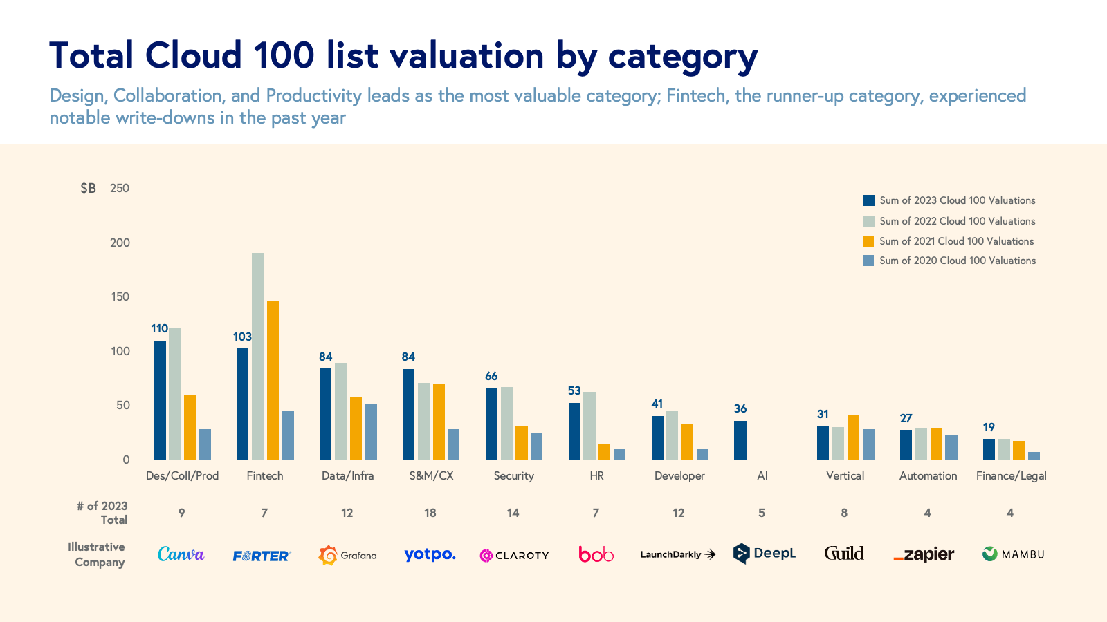 - This year, Design, Collaboration, and Productivity is the highest valued category at $110 billion (17% of list value), followed by Fintech at $103 billion (16% of list value), the highest category last year. (We evaluate Cloud 100 entrants in 12 different categories of cloud computing: AI; Data and Infrastructure; Fintech; Design, Collaboration, and Productivity; Sales, Marketing, and CX; Security; Finance and Legal; Automation; HR; Developer; and Vertical Software.)