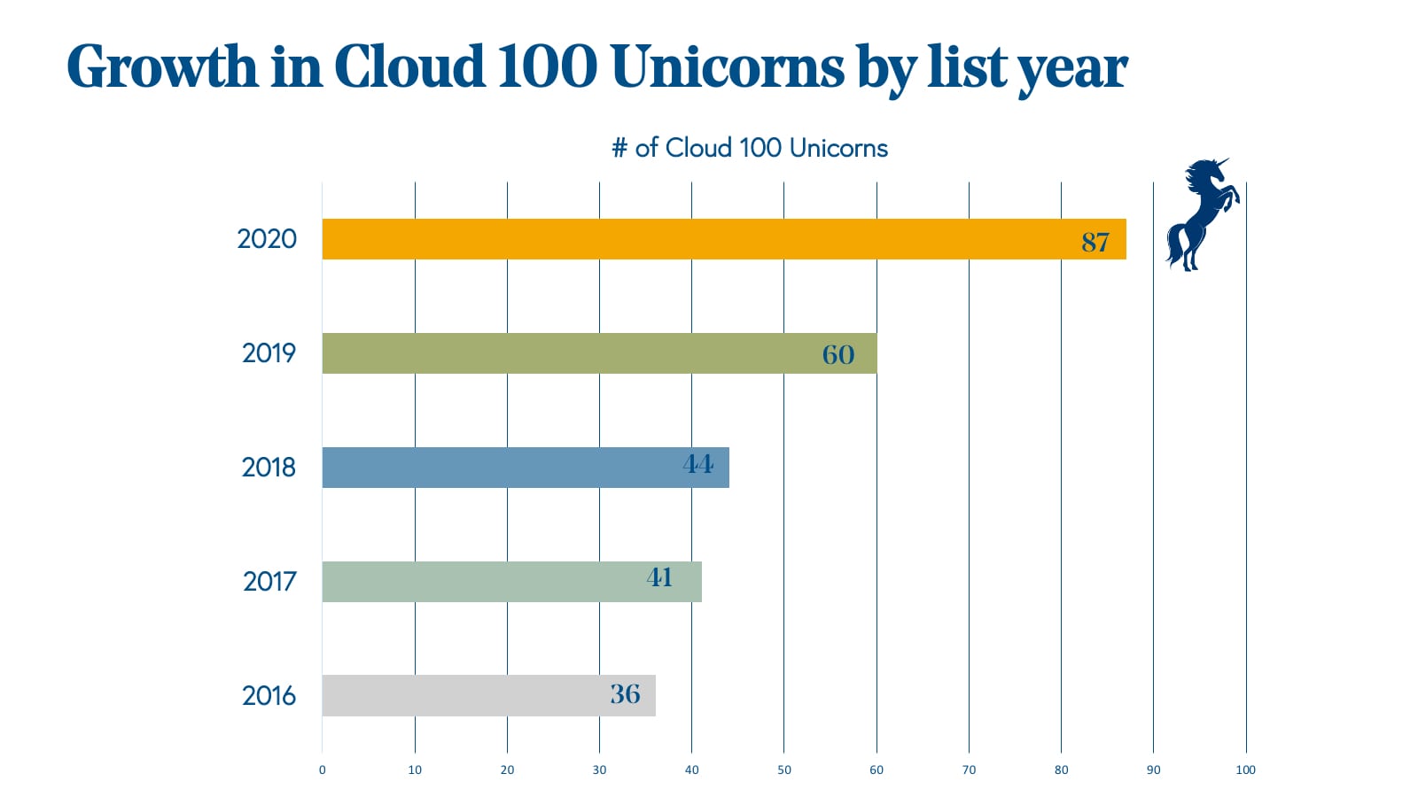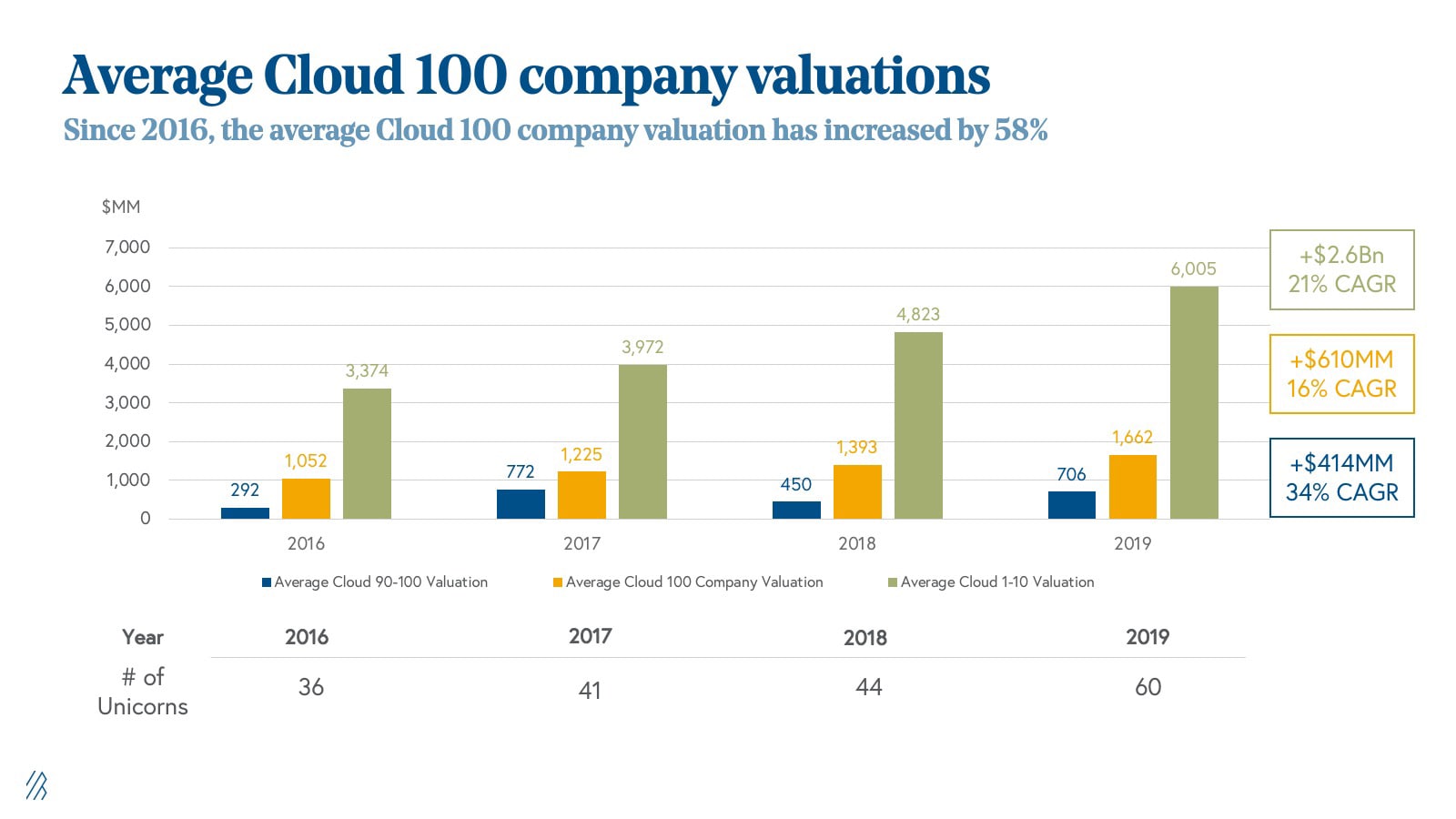 - Private cloud valuations are getting bigger and the market’s appetite for cloud continues to grow. There were 36 unicorns on the Cloud 100 list in 2016, growing to 60 on the 2019 list.