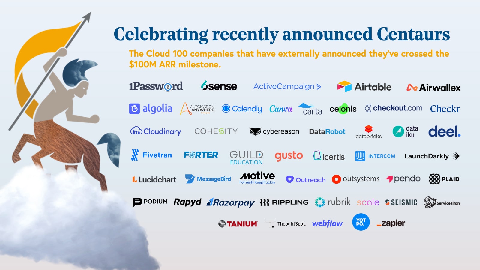 - Last year, we introduced the “Centaur,” a $100 million+ ARR business. In 2022, ~80% of companies on the Cloud 100 list were forecasted to become Centaurs by the end of the year; this year’s list of honorees has raised the bar, with ~95% of honorees forecasted to reach $100 million of ARR by the end of the year.