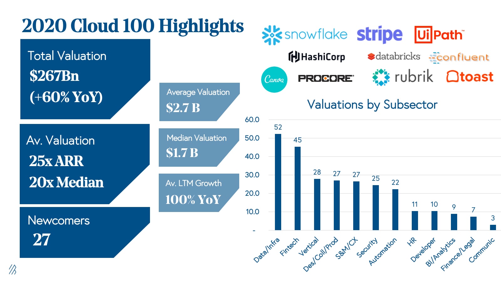 - The threshold to make the Cloud 100 continues to get higher – the median Cloud 100 company is a unicorn, and the average valuation of the Cloud 90-100 is above one billion dollars. This year there are 87 unicorns on the 2020 Cloud 100.