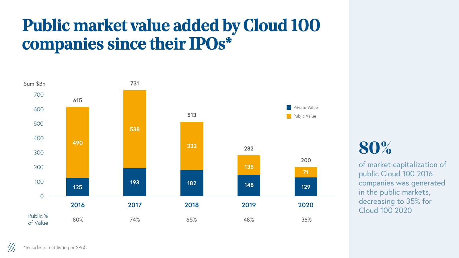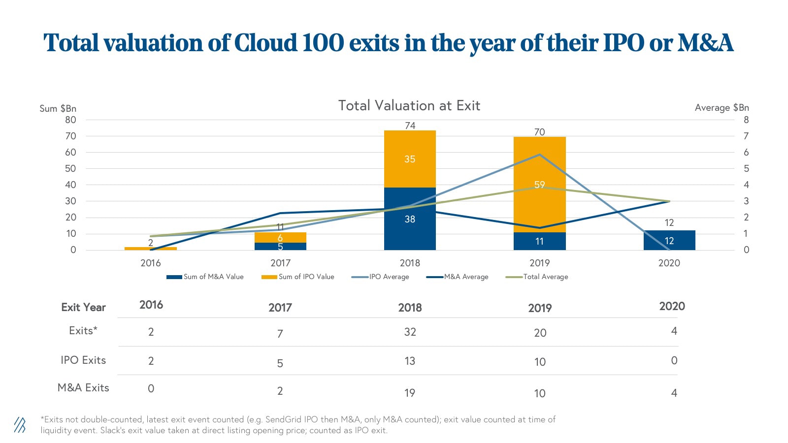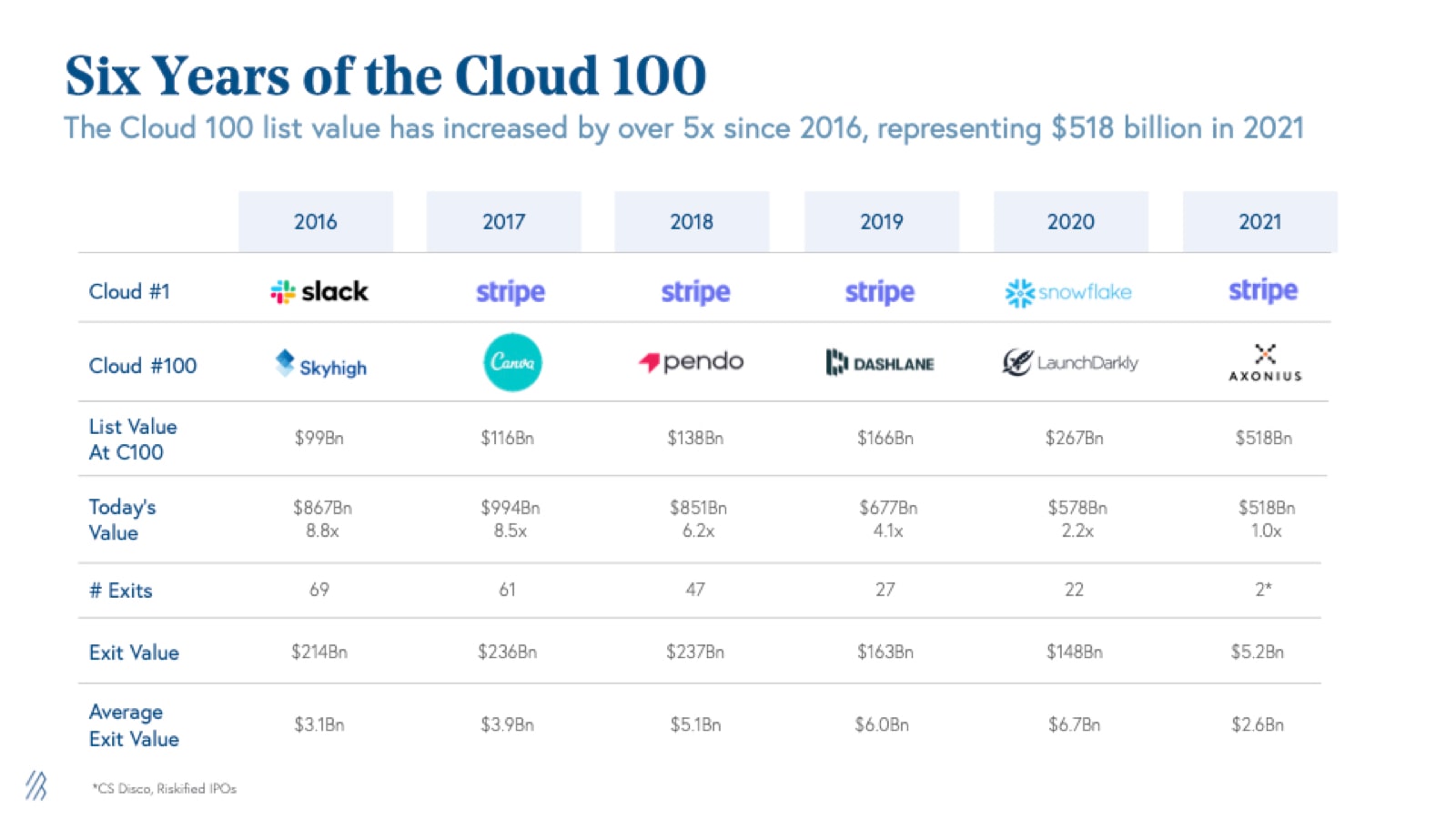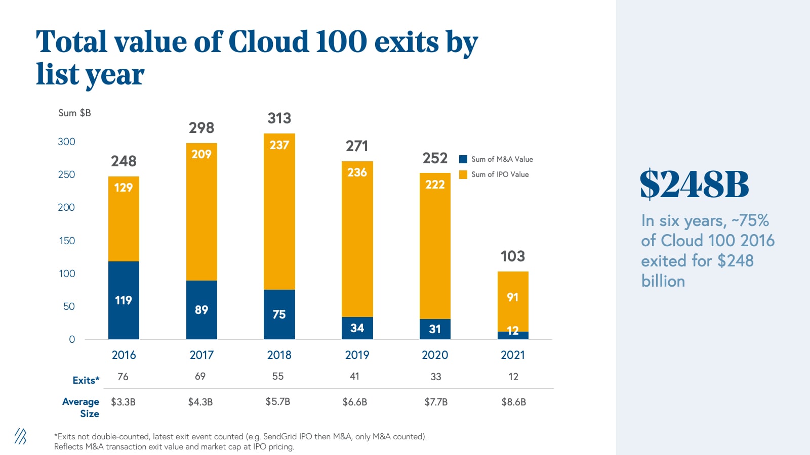 We added 27 new names to the Cloud 100 basket in 2020, bringing the total number of cloud companies that have ever been on the Cloud 100 lists to 204. Of those 204, an incredible 34% have exited in either strategic or financial M&A or public listings, whether IPO or direct listing. These 70 companies have delivered an aggregate of $193 billion of exit value at the time of their exit.