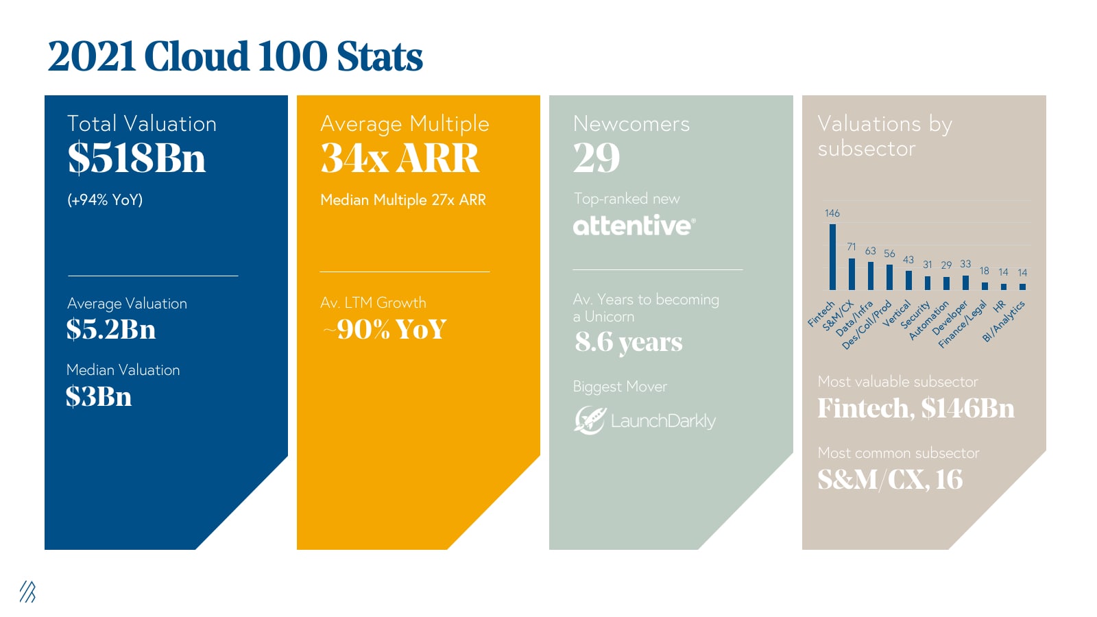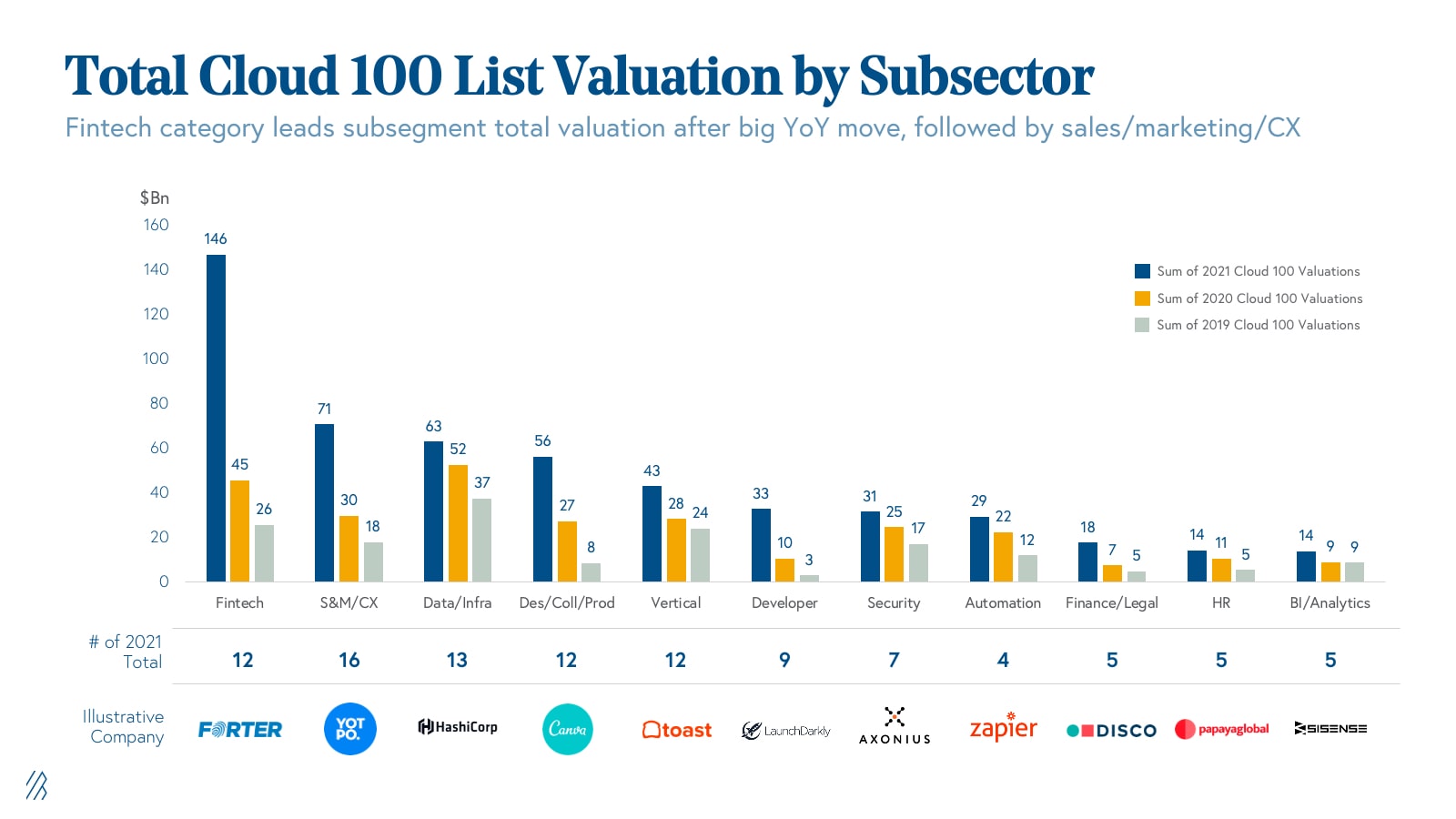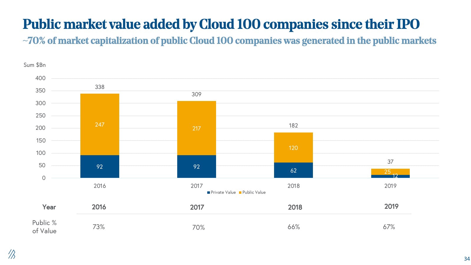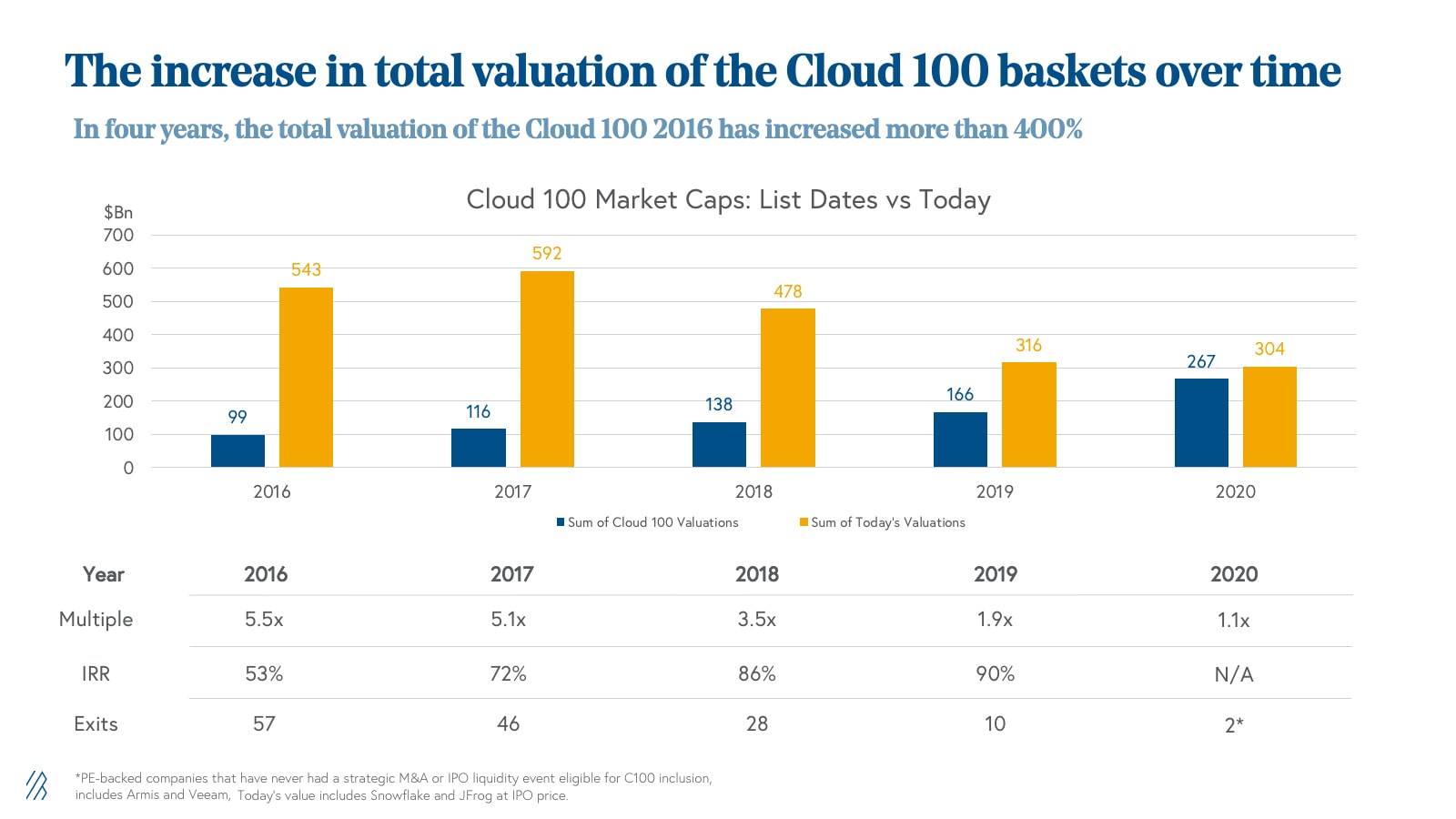 We added 27 new names to the Cloud 100 basket in 2020, bringing the total number of cloud companies that have ever been on the Cloud 100 lists to 204. Of those 204, an incredible 34% have exited in either strategic or financial M&A or public listings, whether IPO or direct listing. These 70 companies have delivered an aggregate of $193 billion of exit value at the time of their exit.