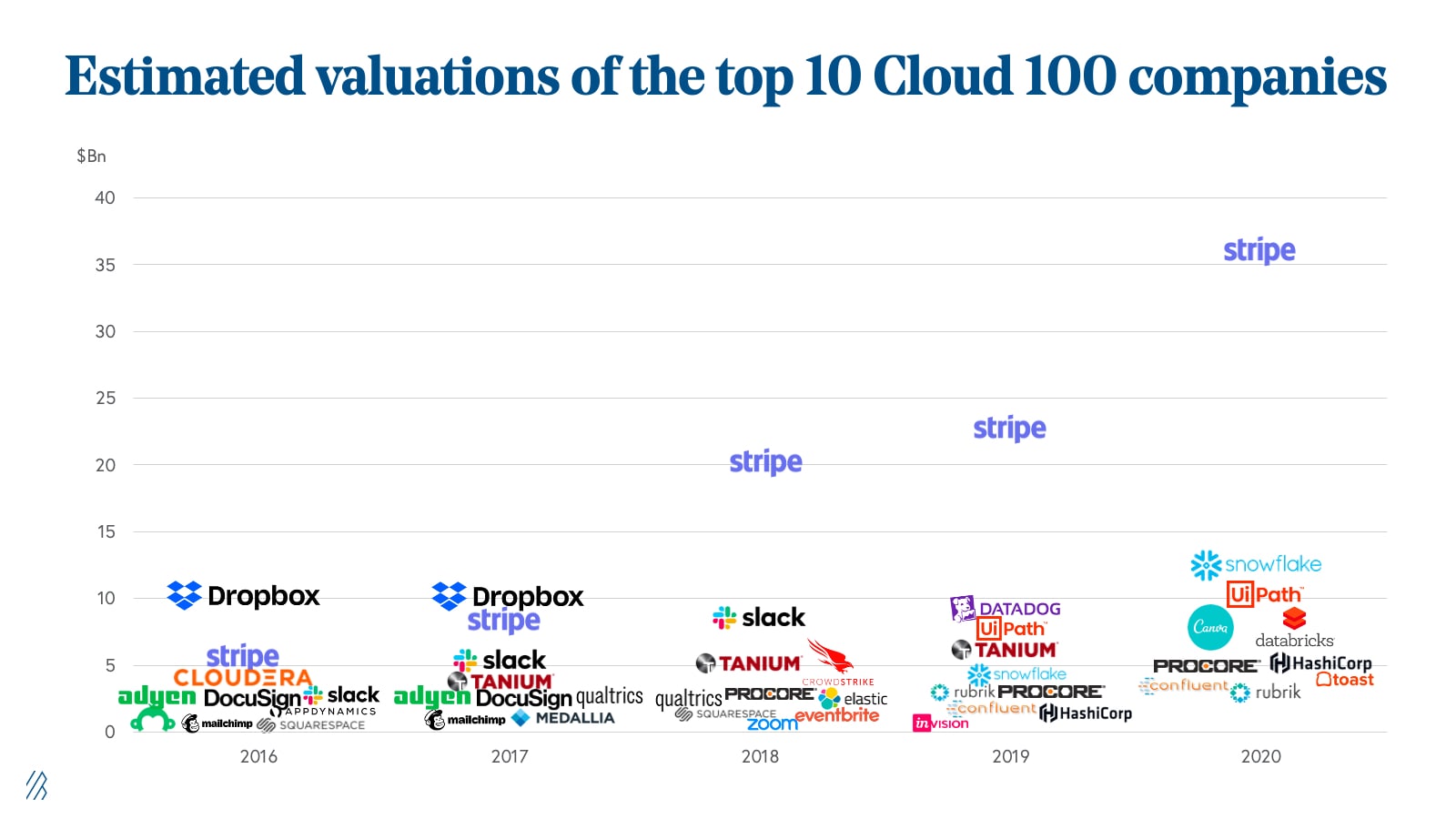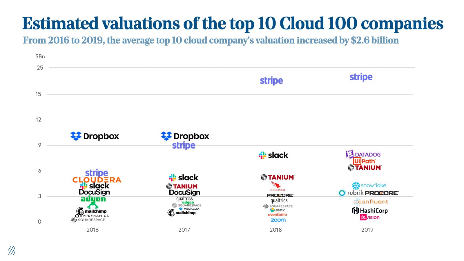 The competition to be one of the 100 best private cloud companies has intensified dramatically over the last five years. To make the list in 2016, companies generally had a $300 million valuation; this year, 87% of the list-makers had a valuation above one billion. While some have been minted as unicorns for years, such as Stripe and Canva, some have achieved the title more recently, such as FiveTran and Blend.