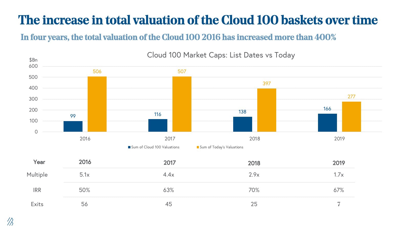 - Each basket of Cloud 100 lists, from 2016 to 2019, has delivered an effective 50-70% internal rate of return (IRR) based on current valuations.