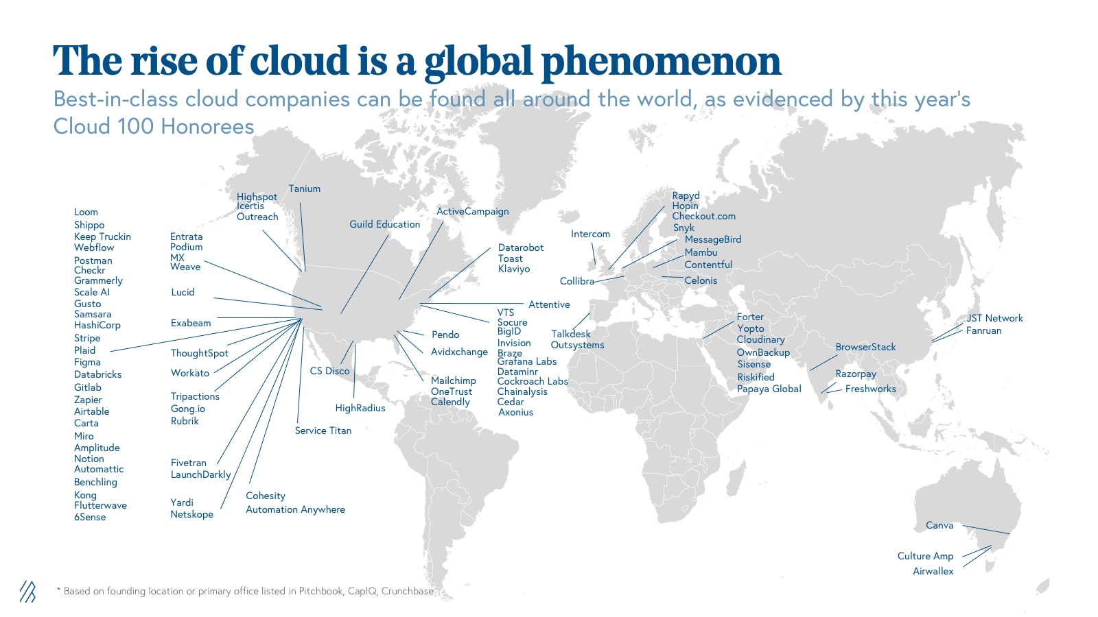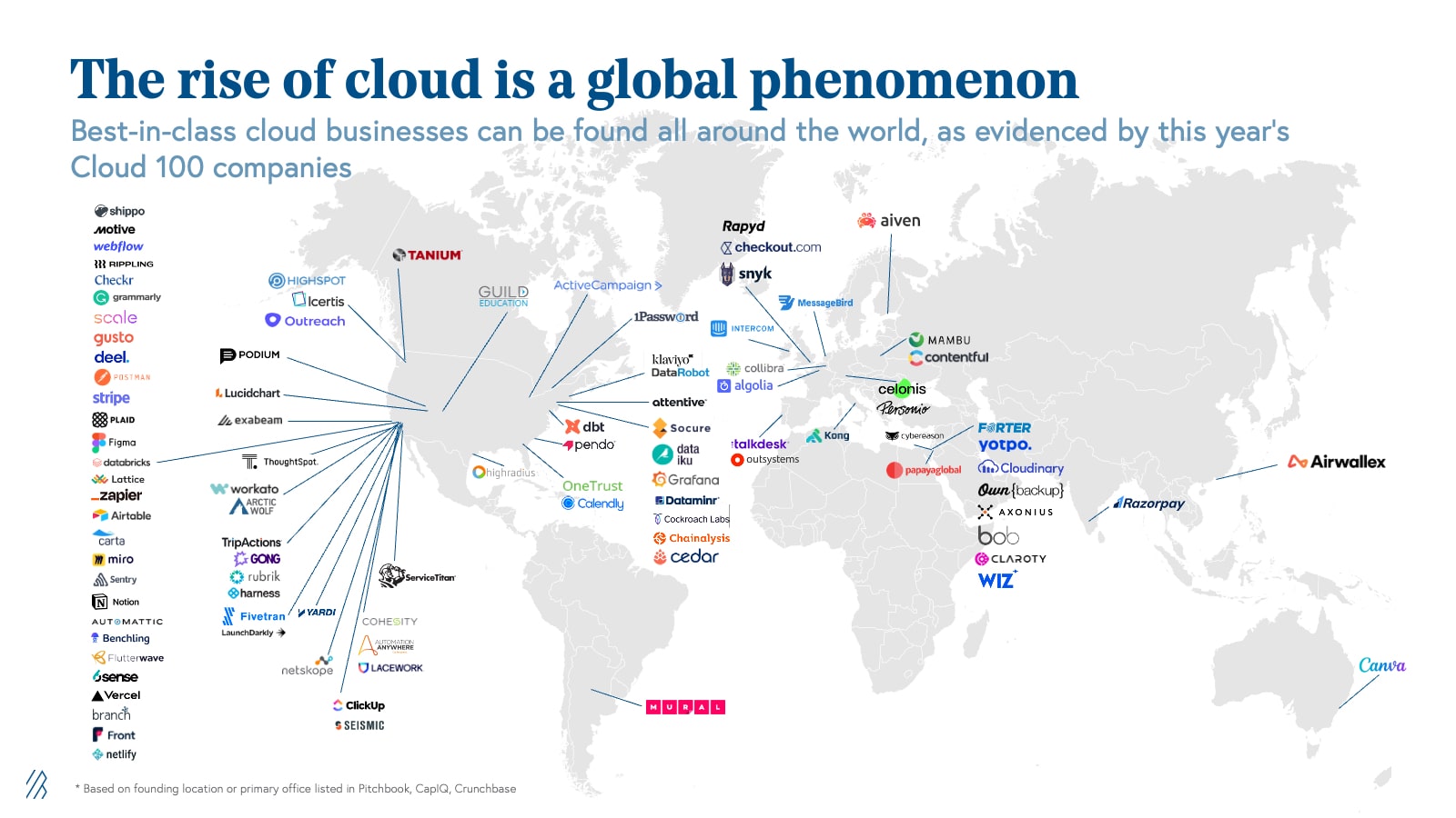 The globalization of cloud continues. As entrepreneurs, operators, and investors all around the world increasingly recognize the power of the cloud, we’re seeing cloud startups bloom in technology hubs globally. The Cloud serves as the backbone for emerging tech communities across the globe as startup teams have more flexibility and agency than ever before. In the Work from Anywhere movement, we’ve found that remote-first and distributed cloud teams across North and South America, EMEA, and APAC experienced more efficiency, increased scalability, and higher access to diverse pools of talent from all around the world. International representation on the Cloud 100 list reached almost 30% this year, and we expect this trend to continue for many more years to come, making the Cloud 100 more and more geographically diverse. We believe entrepreneurship is borderless, and we’re excited to continue to back cloud entrepreneurs around the world, from Canva in Australia to Mambu in Germany!