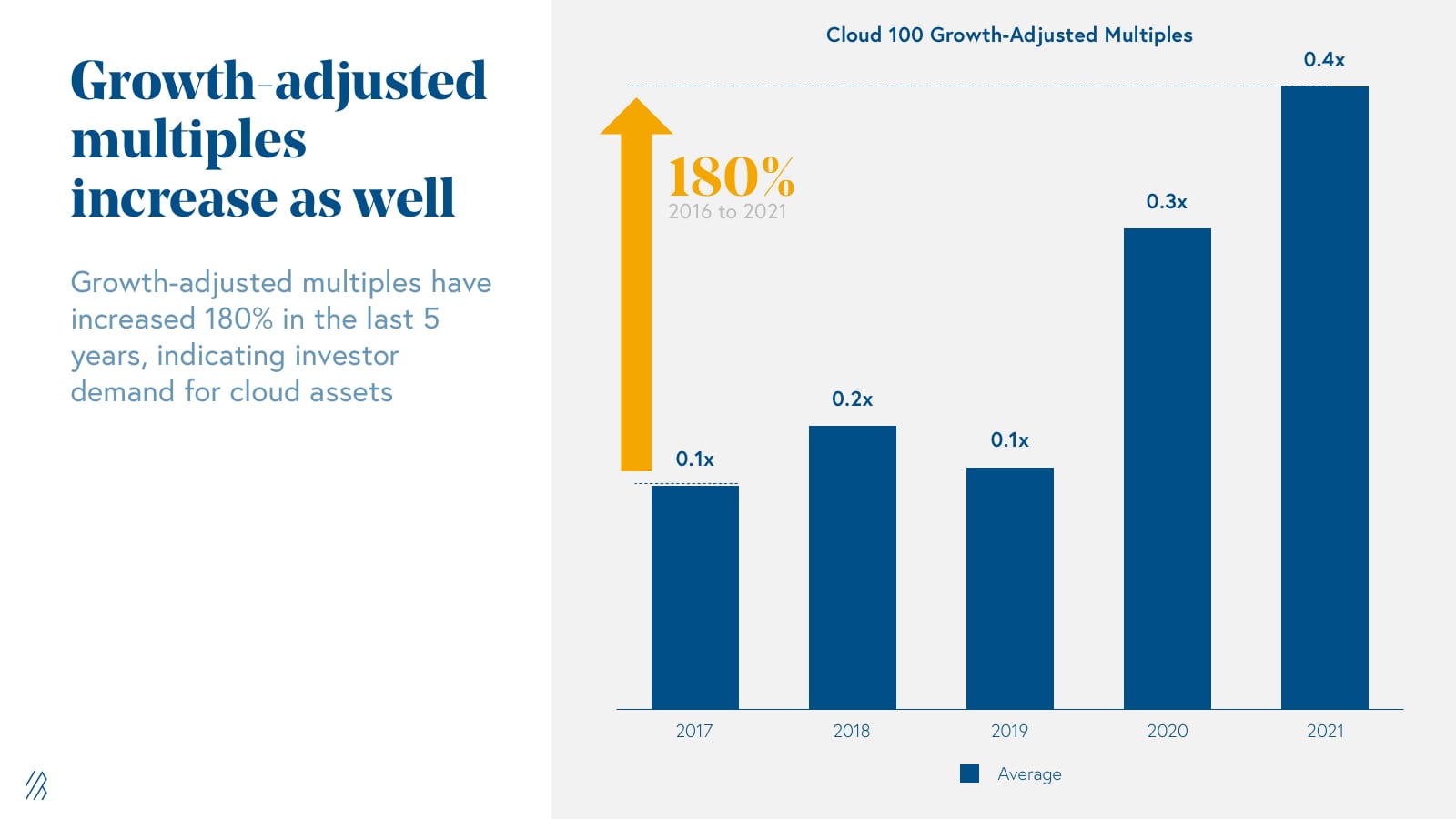Cloud 100 data, however, points to the fact that in the private markets, multiples are expanding even on a growth-adjusted basis. From 2017 to 2021, the average growth-adjusted multiple for Cloud 100 companies increased by 180%, meaning that investors are willing to pay higher prices for the same growth rates; they are not both increasing in lock-step. We believe that this dynamic stems from high investor appetite for strong cloud businesses and the willingness to pay premium valuations for access to these special companies.